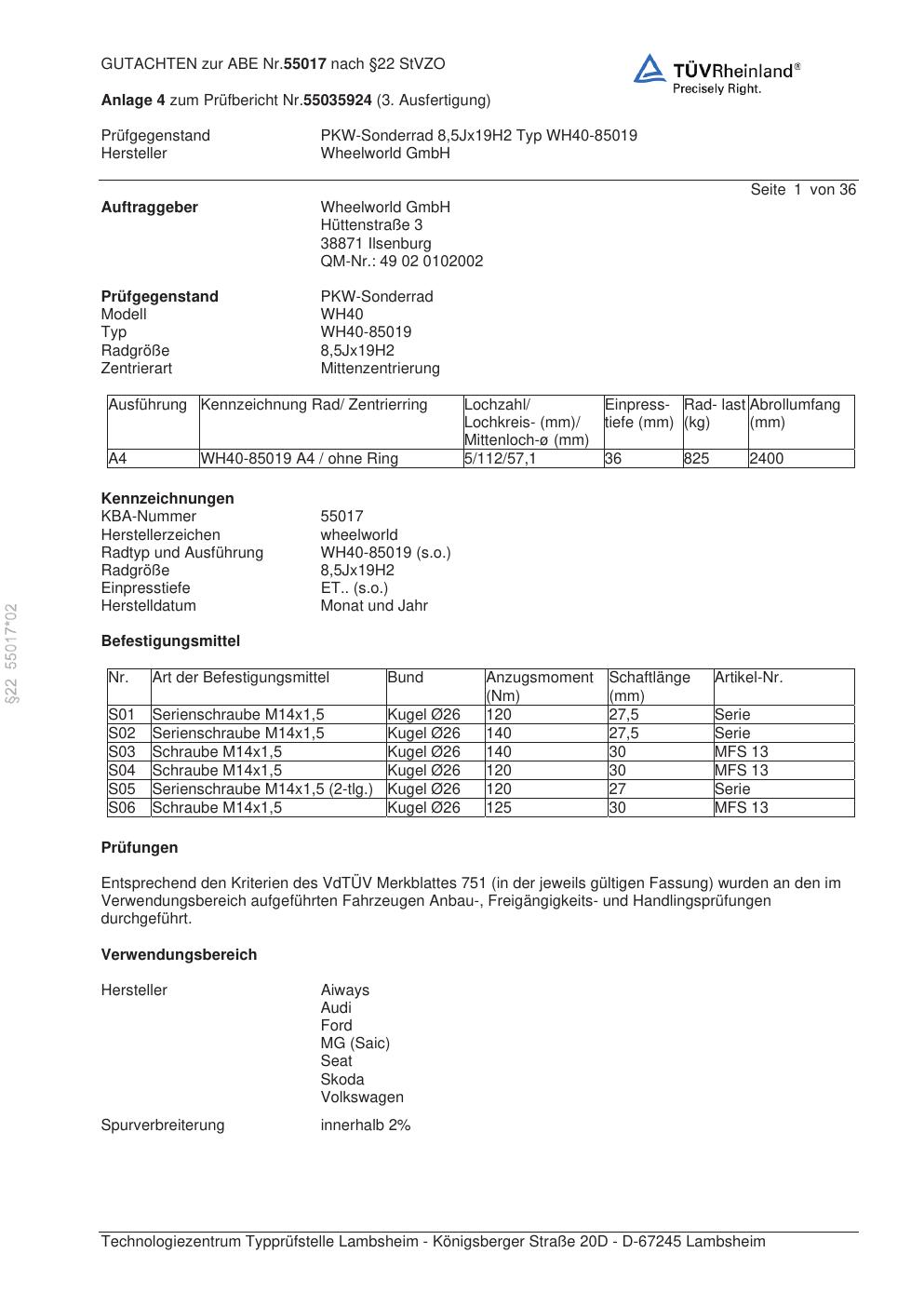 Dieses Gutachten (abe) bezieht sich auf die Alufelge Wheelworld GmbH WH40-85019 in der Ausführung ET 0, Mittenloch 0 mm (KBA 55017). Im PDF findest du typischerweise zulässige Reifengrößen, Auflagen/Anbauhinweise und – je nach Dokument – Hinweise zur Eintragung.