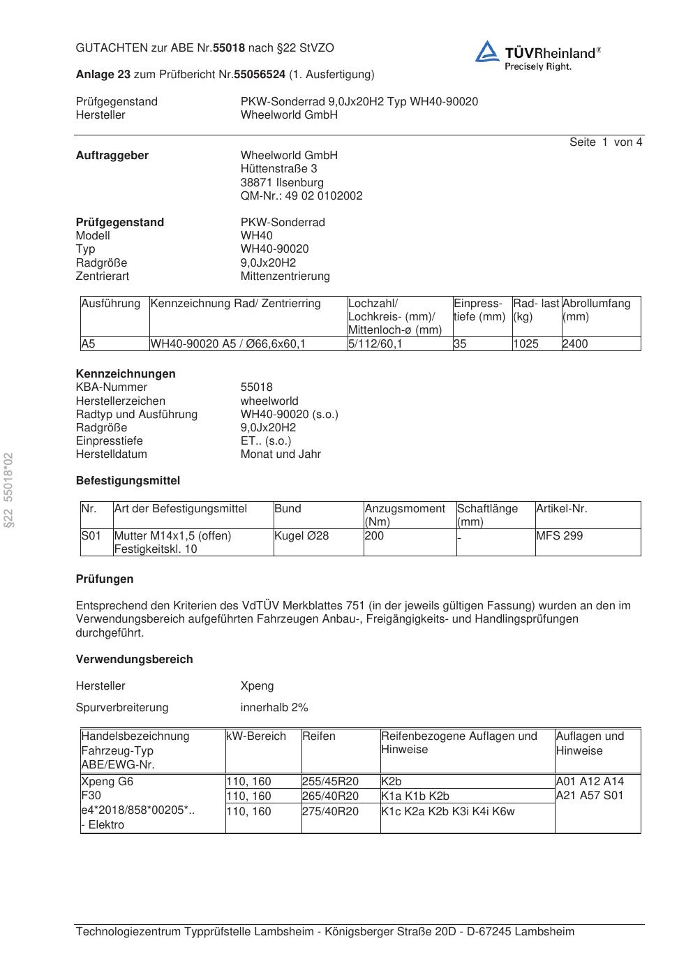 Dieses Gutachten (abe) bezieht sich auf die Alufelge Wheelworld WH40-90020 in der Ausführung ET 0, Mittenloch 0 mm (KBA 55018). Im PDF findest du typischerweise zulässige Reifengrößen, Auflagen/Anbauhinweise und – je nach Dokument – Hinweise zur Eintragung.