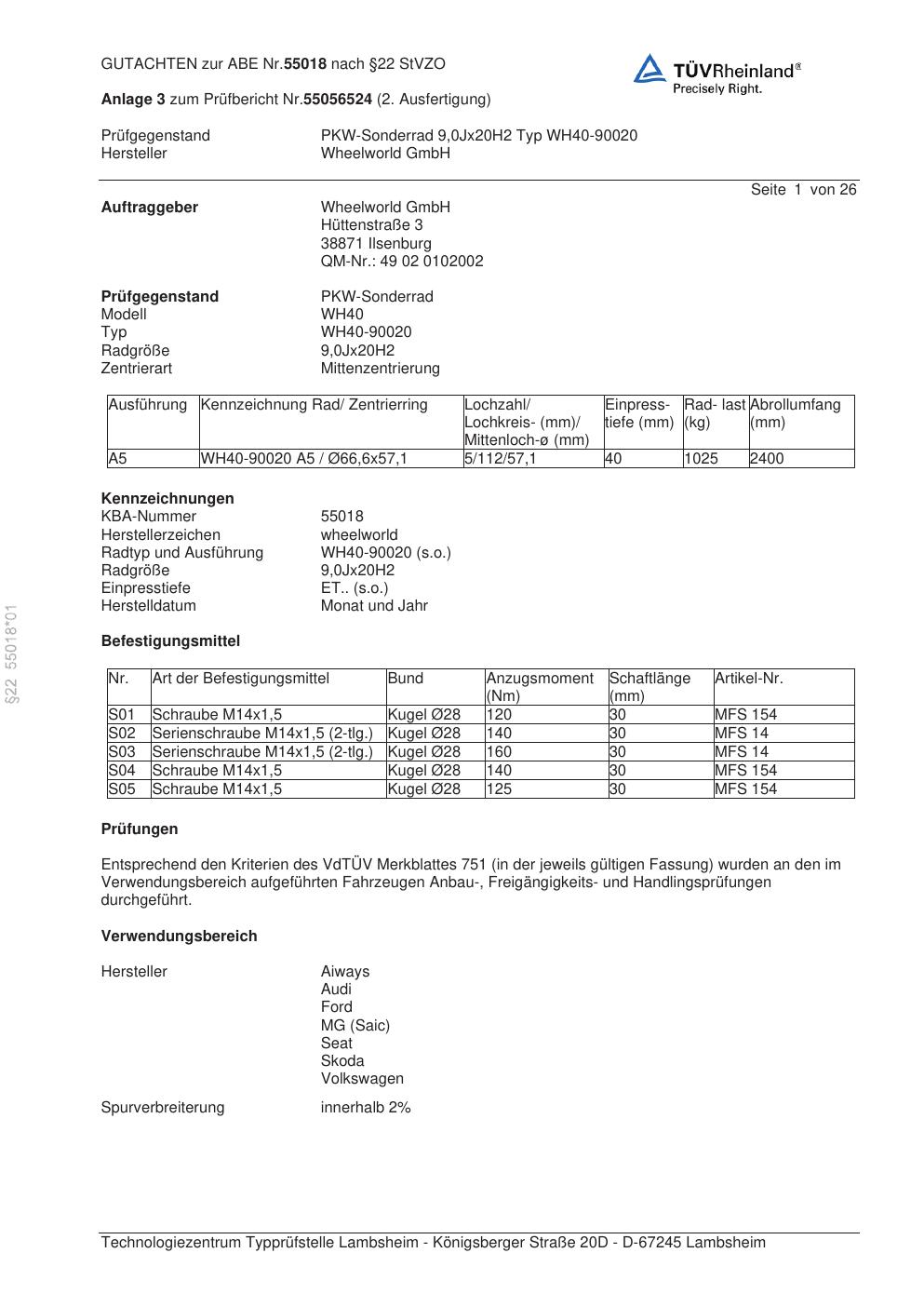 Dieses Gutachten (abe) bezieht sich auf die Alufelge Wheelworld WH40-90020 in der Ausführung ET 0, Mittenloch 0 mm (KBA 55018). Im PDF findest du typischerweise zulässige Reifengrößen, Auflagen/Anbauhinweise und – je nach Dokument – Hinweise zur Eintragung.