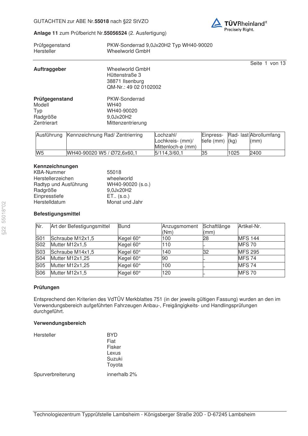Dieses Gutachten (abe) bezieht sich auf die Alufelge Wheelworld WH40-90020 in der Ausführung ET 0, Mittenloch 0 mm (KBA 55018). Im PDF findest du typischerweise zulässige Reifengrößen, Auflagen/Anbauhinweise und – je nach Dokument – Hinweise zur Eintragung.