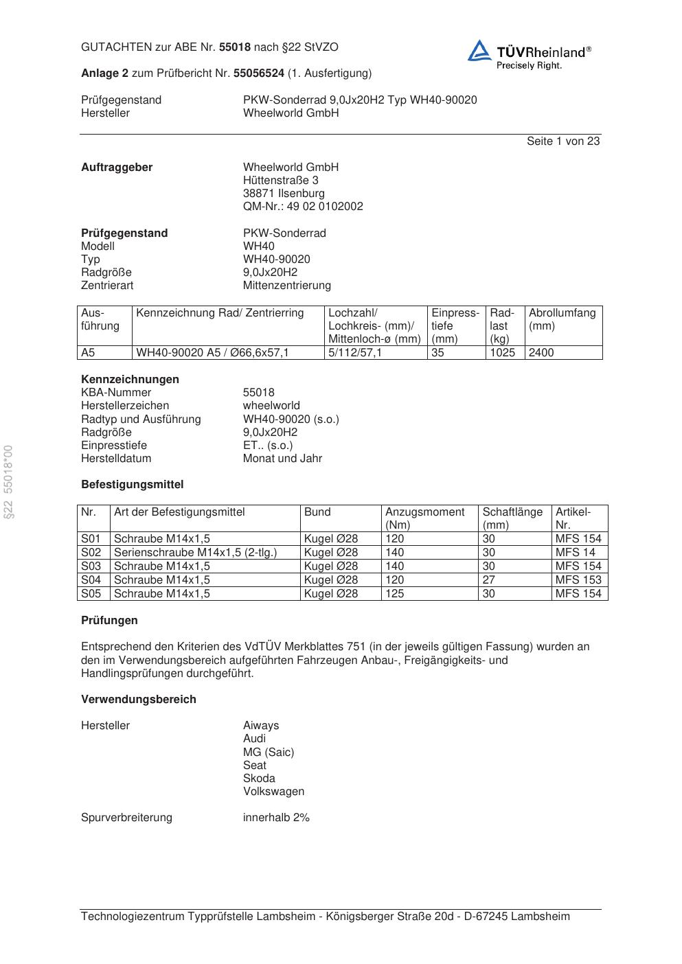 Dieses Gutachten (abe) bezieht sich auf die Alufelge Wheelworld WH40-90020 in der Ausführung ET 0, Mittenloch 0 mm (KBA 55018). Im PDF findest du typischerweise zulässige Reifengrößen, Auflagen/Anbauhinweise und – je nach Dokument – Hinweise zur Eintragung.