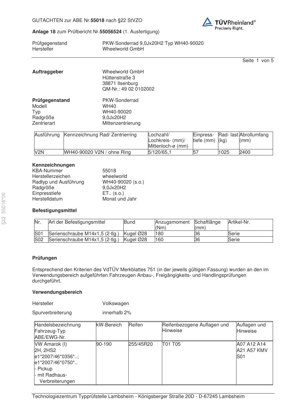 Dieses Gutachten (abe) bezieht sich auf die Alufelge Wheelworld WH40-90020 in der Ausführung ET 0, Mittenloch 0 mm (KBA 55018). Im PDF findest du typischerweise zulässige Reifengrößen, Auflagen/Anbauhinweise und – je nach Dokument – Hinweise zur Eintragung.