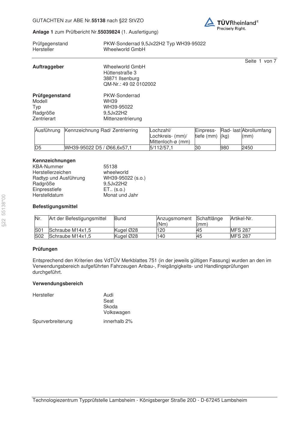 Dieses Gutachten (abe) bezieht sich auf die Alufelge Wheelworld GmbH WH39-95022 in der Ausführung ET 0, Mittenloch 0 mm (KBA 55138). Im PDF findest du typischerweise zulässige Reifengrößen, Auflagen/Anbauhinweise und – je nach Dokument – Hinweise zur Eintragung.
