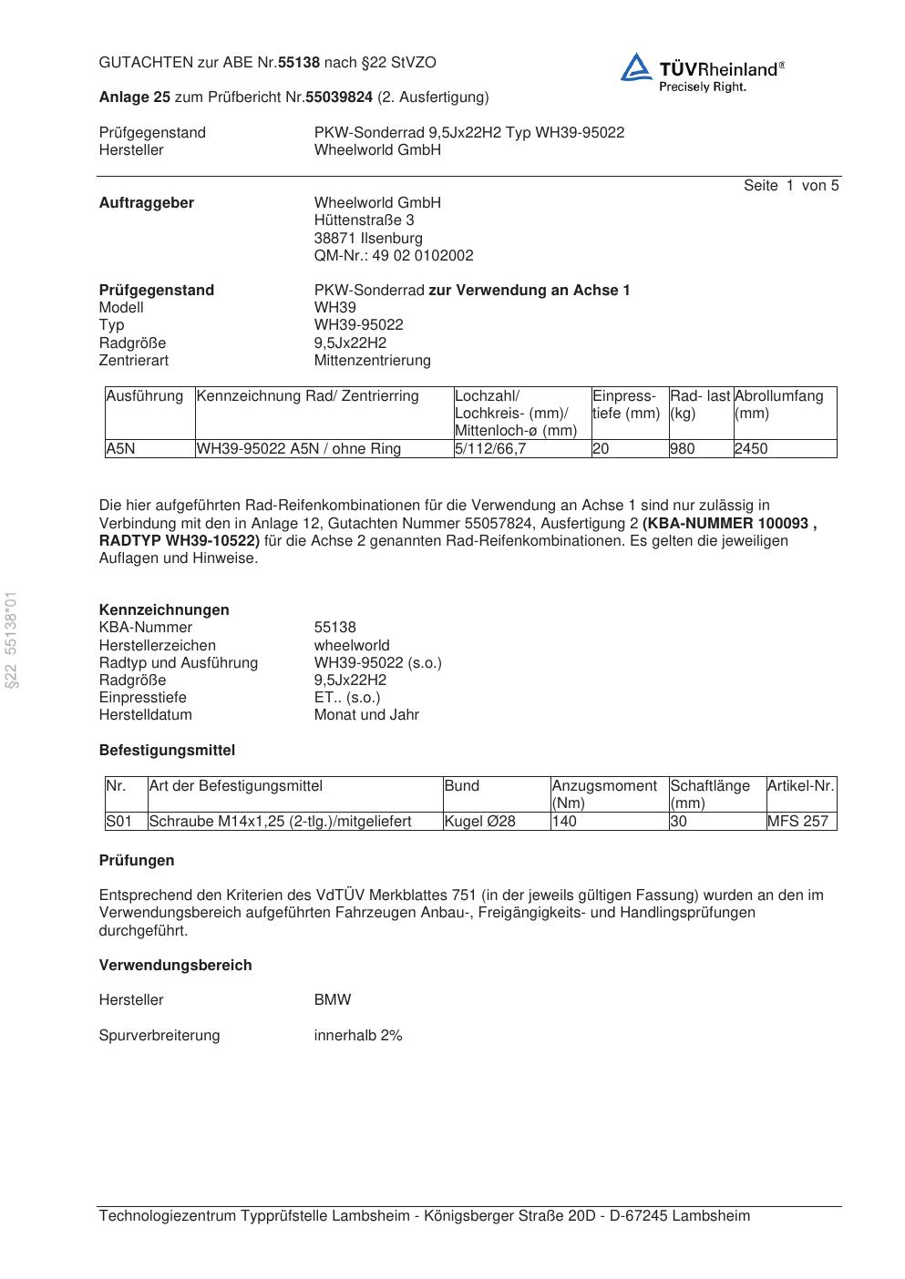 Dieses Gutachten (abe) bezieht sich auf die Alufelge Wheelworld GmbH WH39-95022 in der Ausführung ET 0, Mittenloch 0 mm (KBA 55138). Im PDF findest du typischerweise zulässige Reifengrößen, Auflagen/Anbauhinweise und – je nach Dokument – Hinweise zur Eintragung.