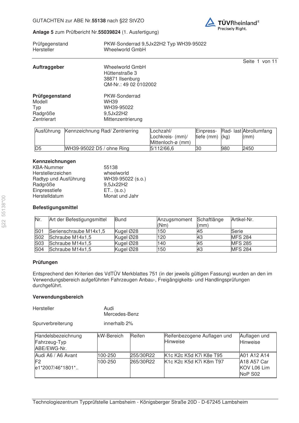 Dieses Gutachten (abe) bezieht sich auf die Alufelge Wheelworld GmbH WH39-95022 in der Ausführung ET 0, Mittenloch 0 mm (KBA 55138). Im PDF findest du typischerweise zulässige Reifengrößen, Auflagen/Anbauhinweise und – je nach Dokument – Hinweise zur Eintragung.