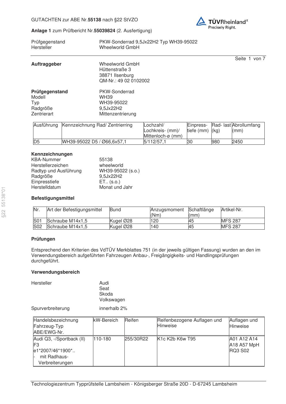 Dieses Gutachten (abe) bezieht sich auf die Alufelge Wheelworld GmbH WH39-95022 in der Ausführung ET 0, Mittenloch 0 mm (KBA 55138). Im PDF findest du typischerweise zulässige Reifengrößen, Auflagen/Anbauhinweise und – je nach Dokument – Hinweise zur Eintragung.