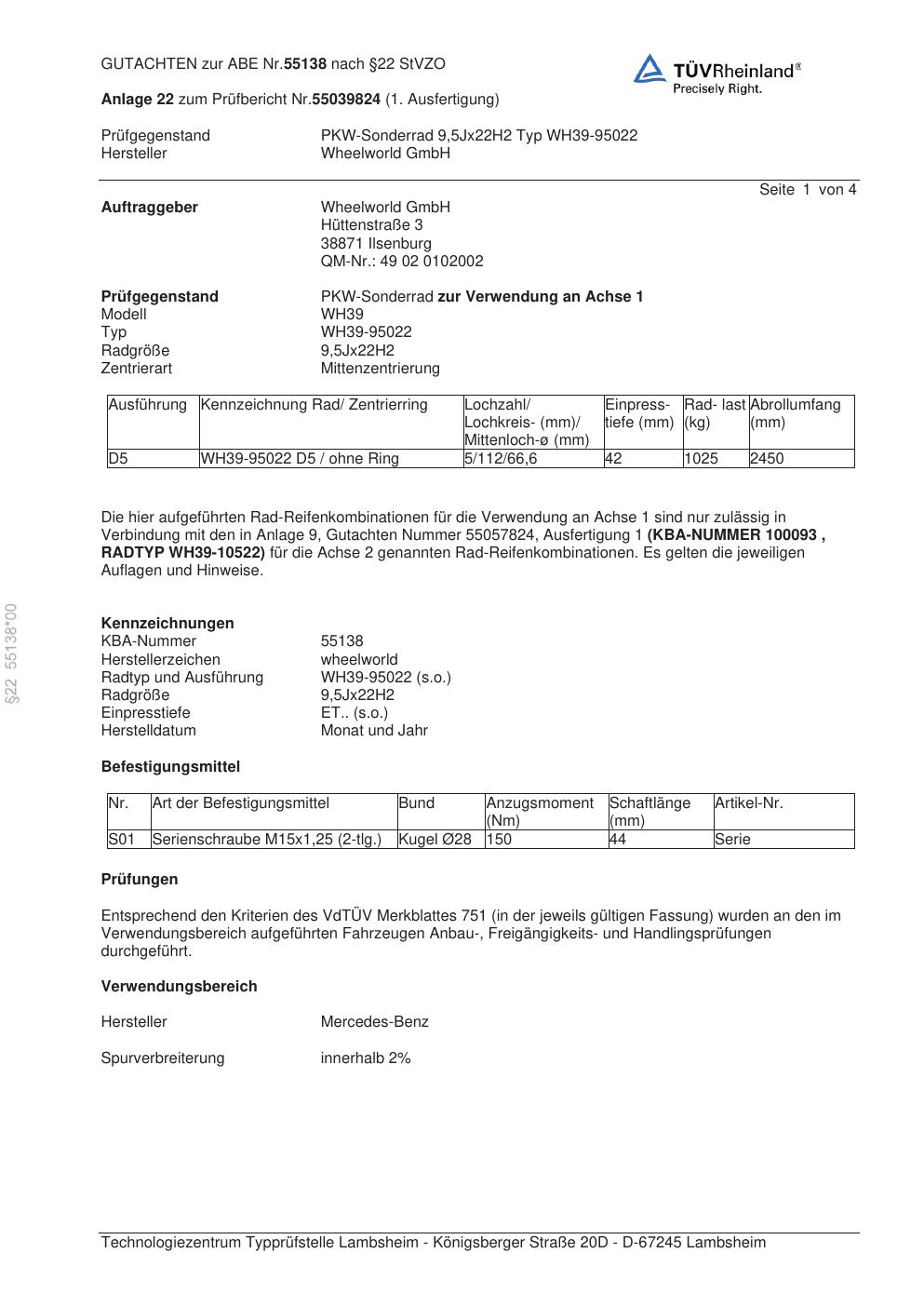 Dieses Gutachten (abe) bezieht sich auf die Alufelge Wheelworld GmbH WH39-95022 in der Ausführung ET 0, Mittenloch 0 mm (KBA 55138). Im PDF findest du typischerweise zulässige Reifengrößen, Auflagen/Anbauhinweise und – je nach Dokument – Hinweise zur Eintragung.