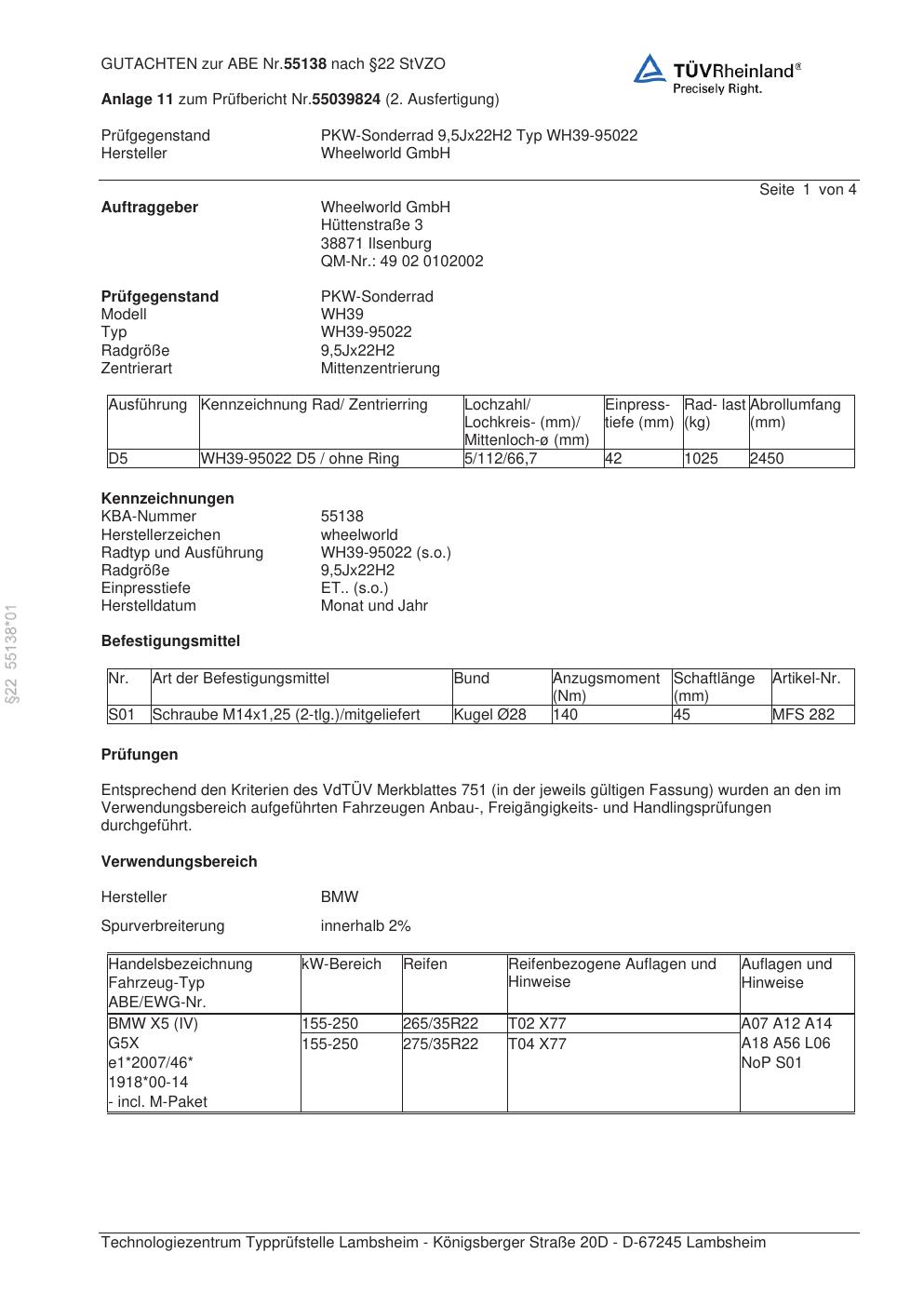 Dieses Gutachten (abe) bezieht sich auf die Alufelge Wheelworld GmbH WH39-95022 in der Ausführung ET 0, Mittenloch 0 mm (KBA 55138). Im PDF findest du typischerweise zulässige Reifengrößen, Auflagen/Anbauhinweise und – je nach Dokument – Hinweise zur Eintragung.