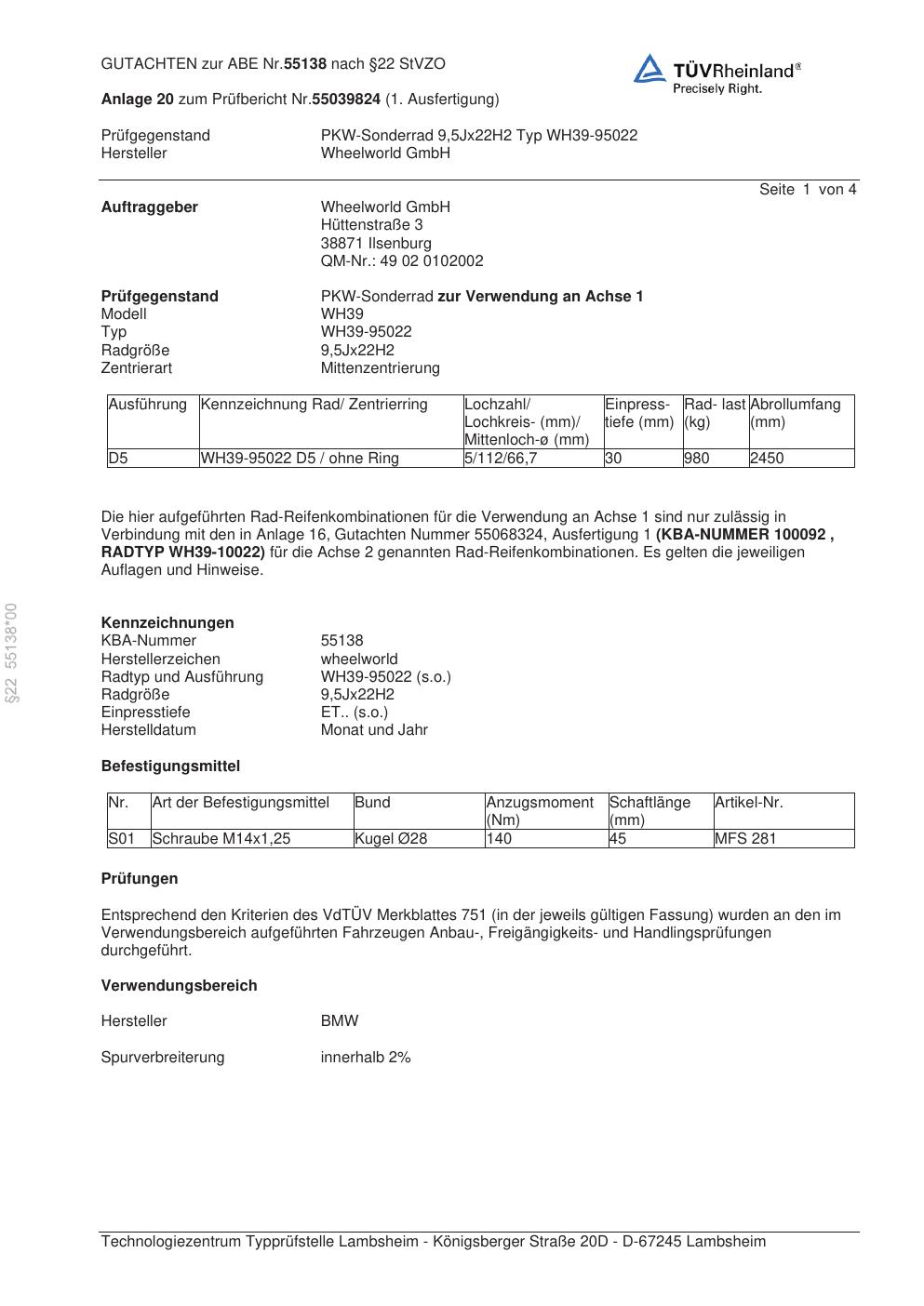 Dieses Gutachten (abe) bezieht sich auf die Alufelge Wheelworld GmbH WH39-95022 in der Ausführung ET 0, Mittenloch 0 mm (KBA 55138). Im PDF findest du typischerweise zulässige Reifengrößen, Auflagen/Anbauhinweise und – je nach Dokument – Hinweise zur Eintragung.