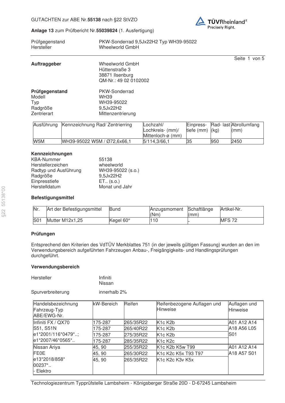 Dieses Gutachten (abe) bezieht sich auf die Alufelge Wheelworld GmbH WH39-95022 in der Ausführung ET 0, Mittenloch 0 mm (KBA 55138). Im PDF findest du typischerweise zulässige Reifengrößen, Auflagen/Anbauhinweise und – je nach Dokument – Hinweise zur Eintragung.
