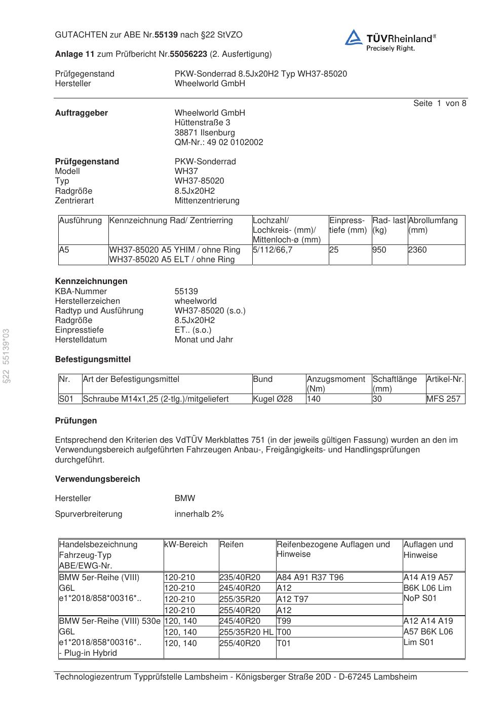 Dieses Gutachten (abe) bezieht sich auf die Alufelge Wheelworld GmbH WH37-85020 in der Ausführung ET 0, Mittenloch 0 mm (KBA 55139). Im PDF findest du typischerweise zulässige Reifengrößen, Auflagen/Anbauhinweise und – je nach Dokument – Hinweise zur Eintragung.