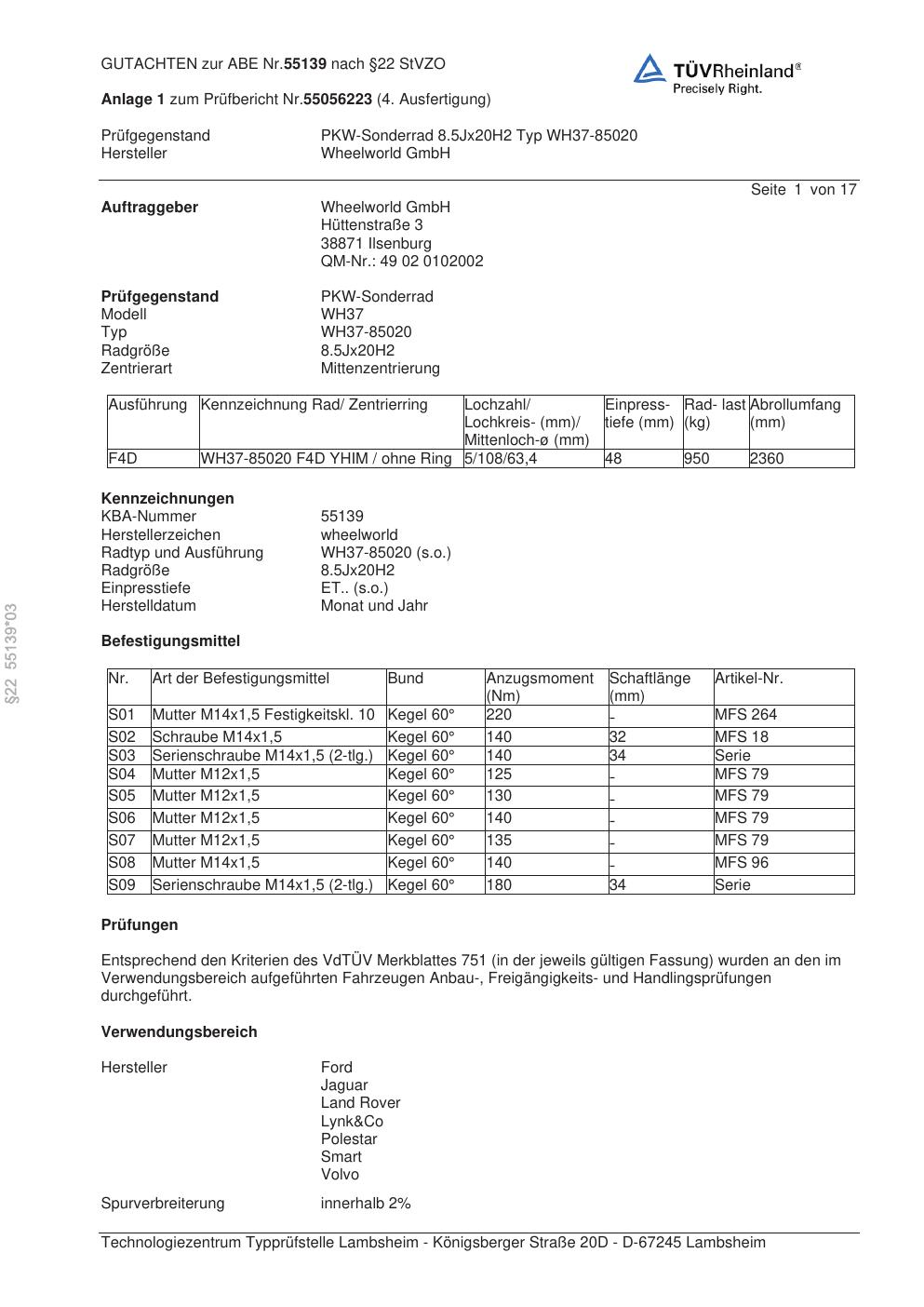 Dieses Gutachten (abe) bezieht sich auf die Alufelge Wheelworld GmbH WH37-85020 in der Ausführung ET 0, Mittenloch 0 mm (KBA 55139). Im PDF findest du typischerweise zulässige Reifengrößen, Auflagen/Anbauhinweise und – je nach Dokument – Hinweise zur Eintragung.