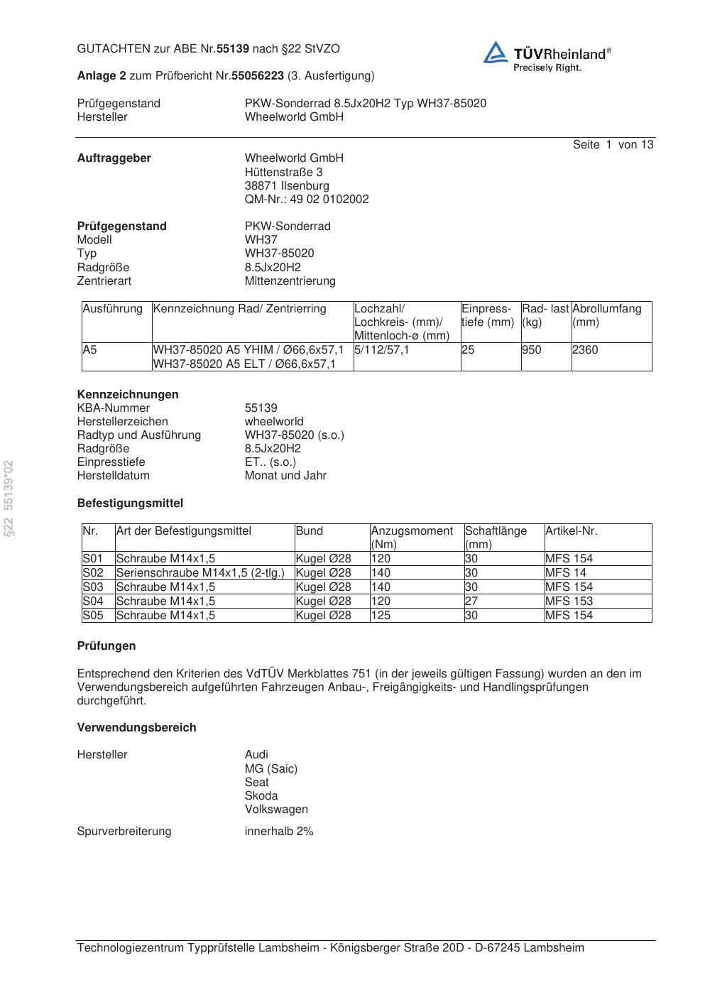 Dieses Gutachten (abe) bezieht sich auf die Alufelge Wheelworld GmbH WH37-85020 in der Ausführung ET 0, Mittenloch 0 mm (KBA 55139). Im PDF findest du typischerweise zulässige Reifengrößen, Auflagen/Anbauhinweise und – je nach Dokument – Hinweise zur Eintragung.