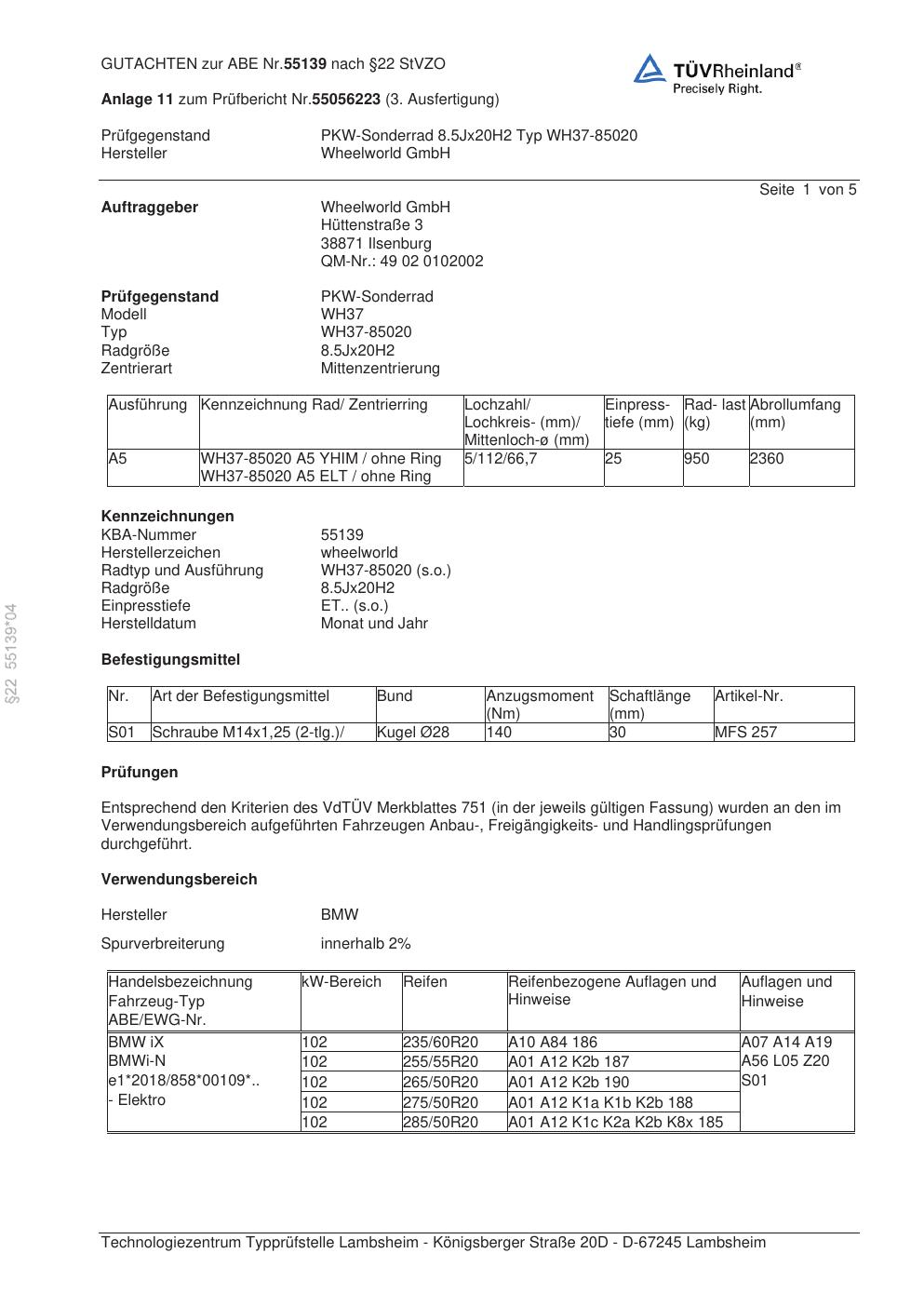 Dieses Gutachten (abe) bezieht sich auf die Alufelge Wheelworld GmbH WH37-85020 in der Ausführung ET 0, Mittenloch 0 mm (KBA 55139). Im PDF findest du typischerweise zulässige Reifengrößen, Auflagen/Anbauhinweise und – je nach Dokument – Hinweise zur Eintragung.