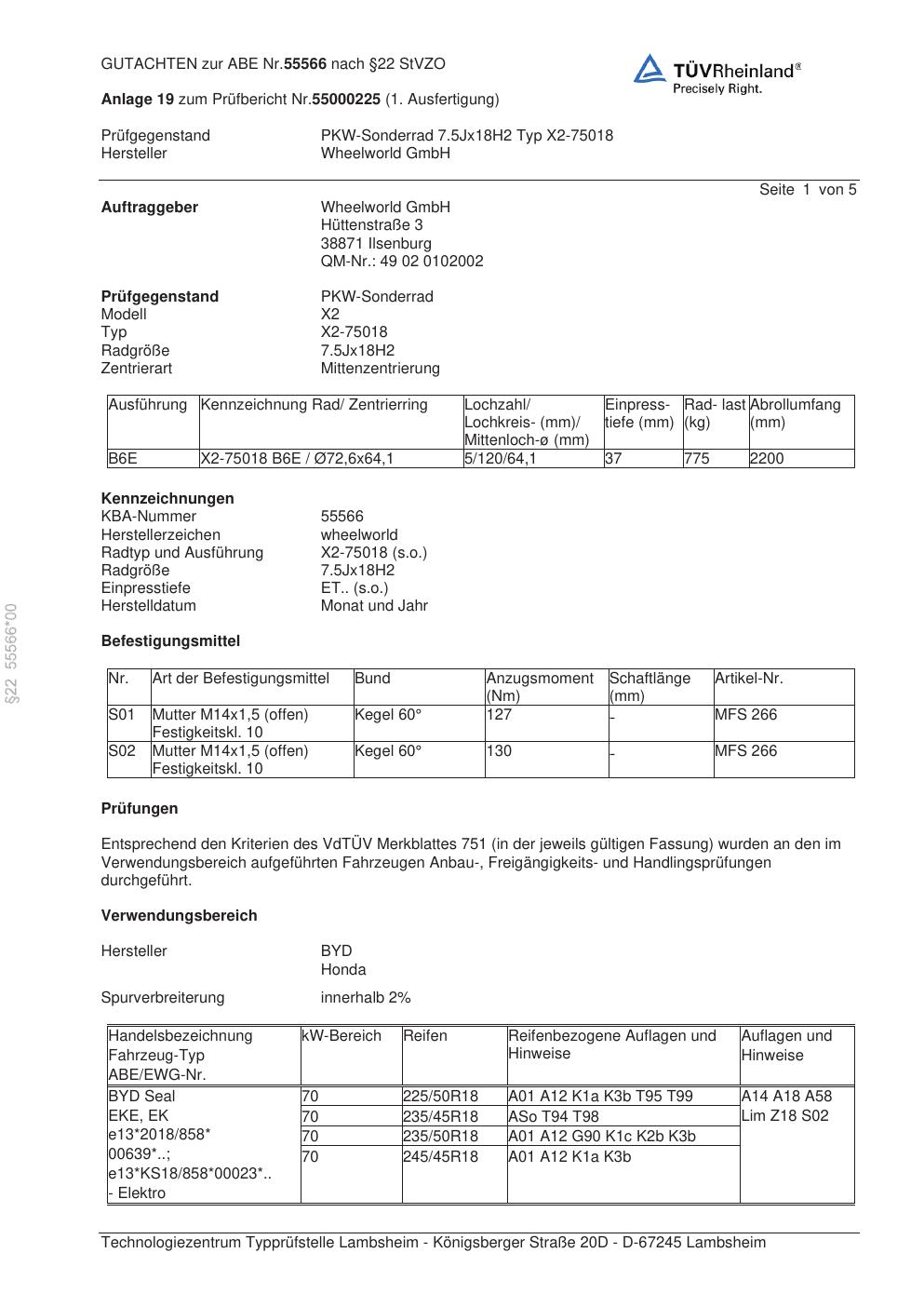 Dieses Gutachten (abe) bezieht sich auf die Alufelge Wheelworld X2-75018 in der Ausführung ET 0, Mittenloch 0 mm (KBA 55566). Im PDF findest du typischerweise zulässige Reifengrößen, Auflagen/Anbauhinweise und – je nach Dokument – Hinweise zur Eintragung.