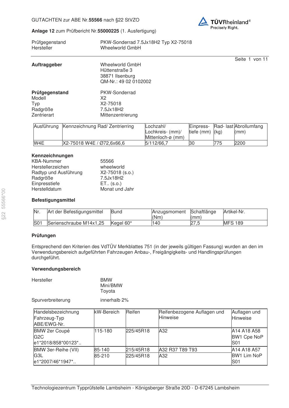 Dieses Gutachten (abe) bezieht sich auf die Alufelge Wheelworld X2-75018 in der Ausführung ET 0, Mittenloch 0 mm (KBA 55566). Im PDF findest du typischerweise zulässige Reifengrößen, Auflagen/Anbauhinweise und – je nach Dokument – Hinweise zur Eintragung.