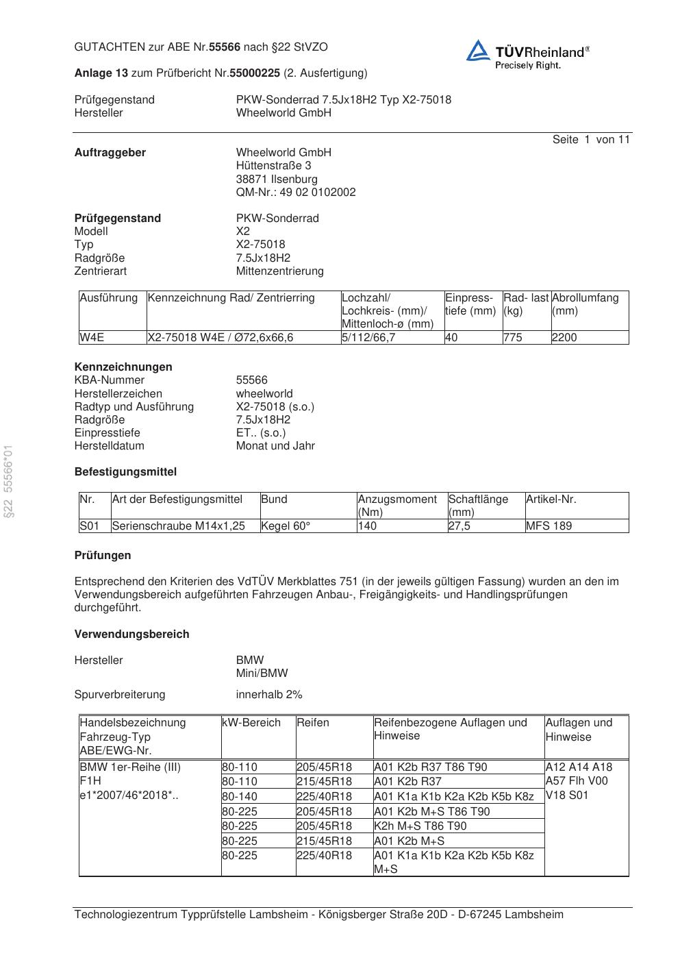 Dieses Gutachten (abe) bezieht sich auf die Alufelge Wheelworld X2-75018 in der Ausführung ET 0, Mittenloch 0 mm (KBA 55566). Im PDF findest du typischerweise zulässige Reifengrößen, Auflagen/Anbauhinweise und – je nach Dokument – Hinweise zur Eintragung.
