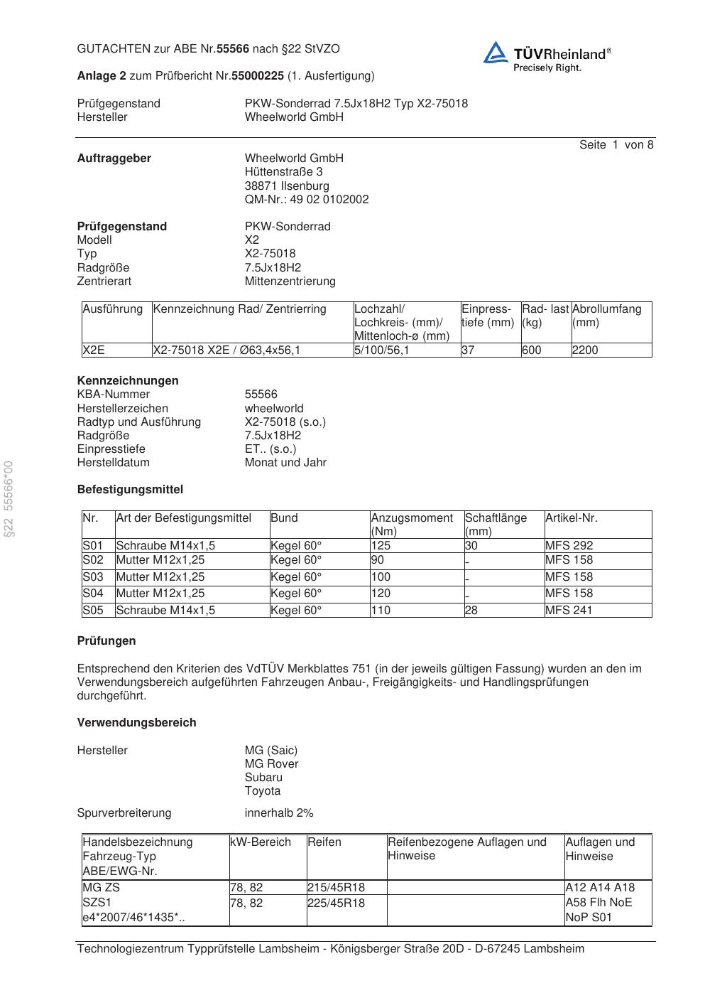 Dieses Gutachten (abe) bezieht sich auf die Alufelge Wheelworld X2-75018 in der Ausführung ET 0, Mittenloch 0 mm (KBA 55566). Im PDF findest du typischerweise zulässige Reifengrößen, Auflagen/Anbauhinweise und – je nach Dokument – Hinweise zur Eintragung.