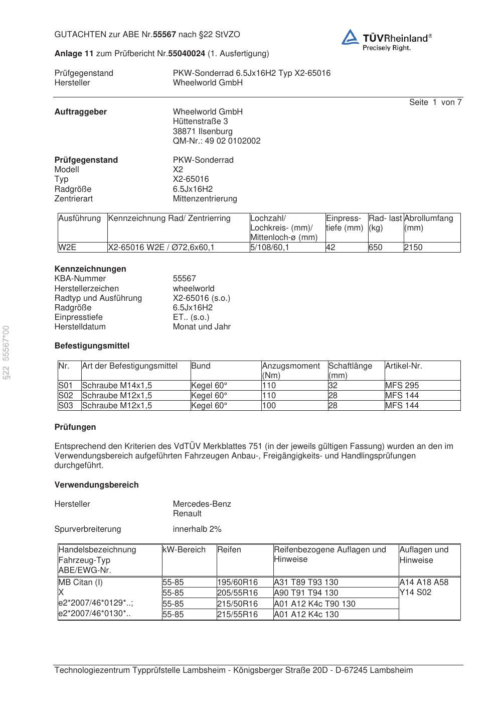 Dieses Gutachten (abe) bezieht sich auf die Alufelge Wheelworld X2-65016 in der Ausführung ET 0, Mittenloch 0 mm (KBA 55567). Im PDF findest du typischerweise zulässige Reifengrößen, Auflagen/Anbauhinweise und – je nach Dokument – Hinweise zur Eintragung.