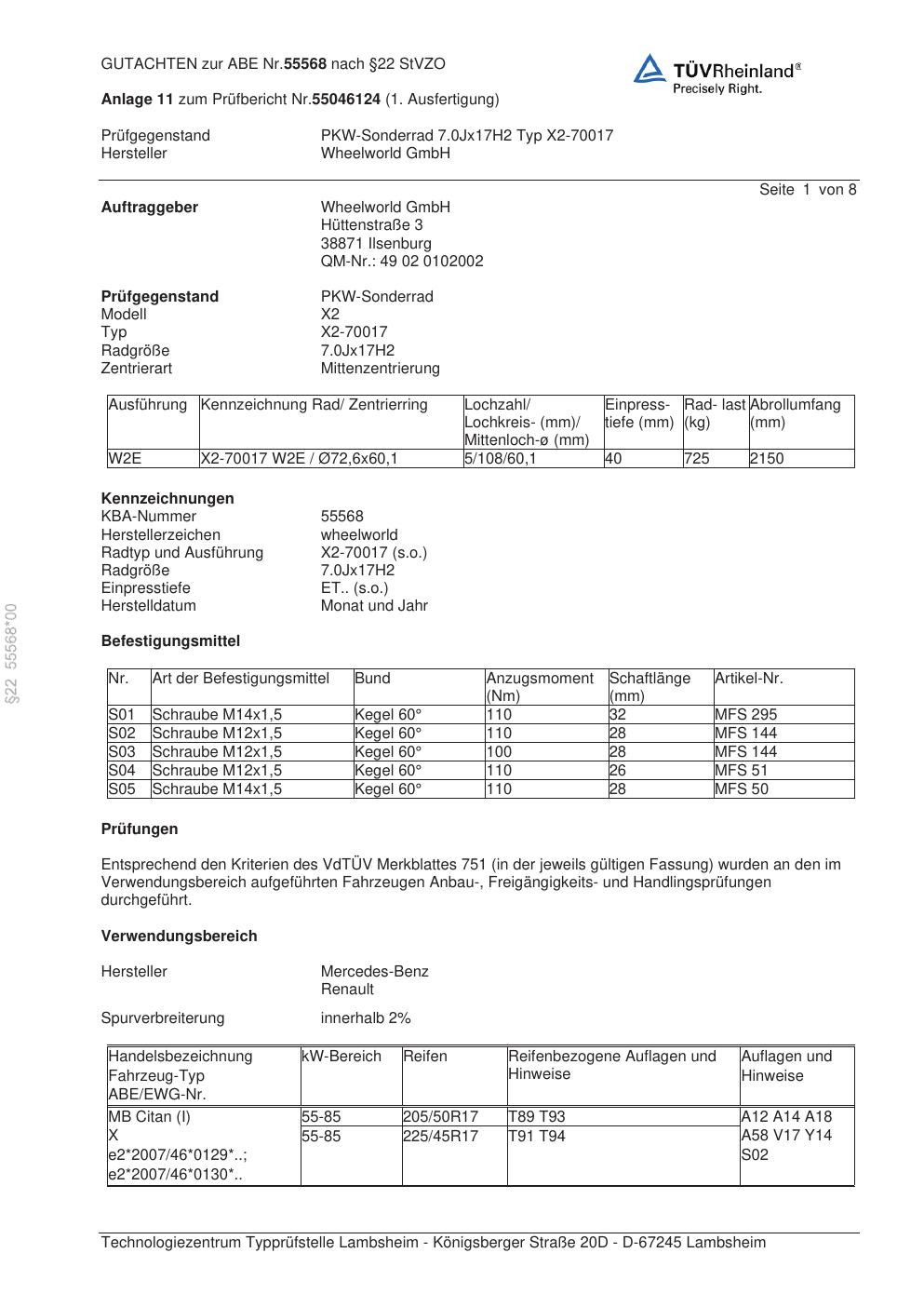 Dieses Gutachten (abe) bezieht sich auf die Alufelge Wheelworld X2-70017 in der Ausführung ET 0, Mittenloch 0 mm (KBA 55568). Im PDF findest du typischerweise zulässige Reifengrößen, Auflagen/Anbauhinweise und – je nach Dokument – Hinweise zur Eintragung.
