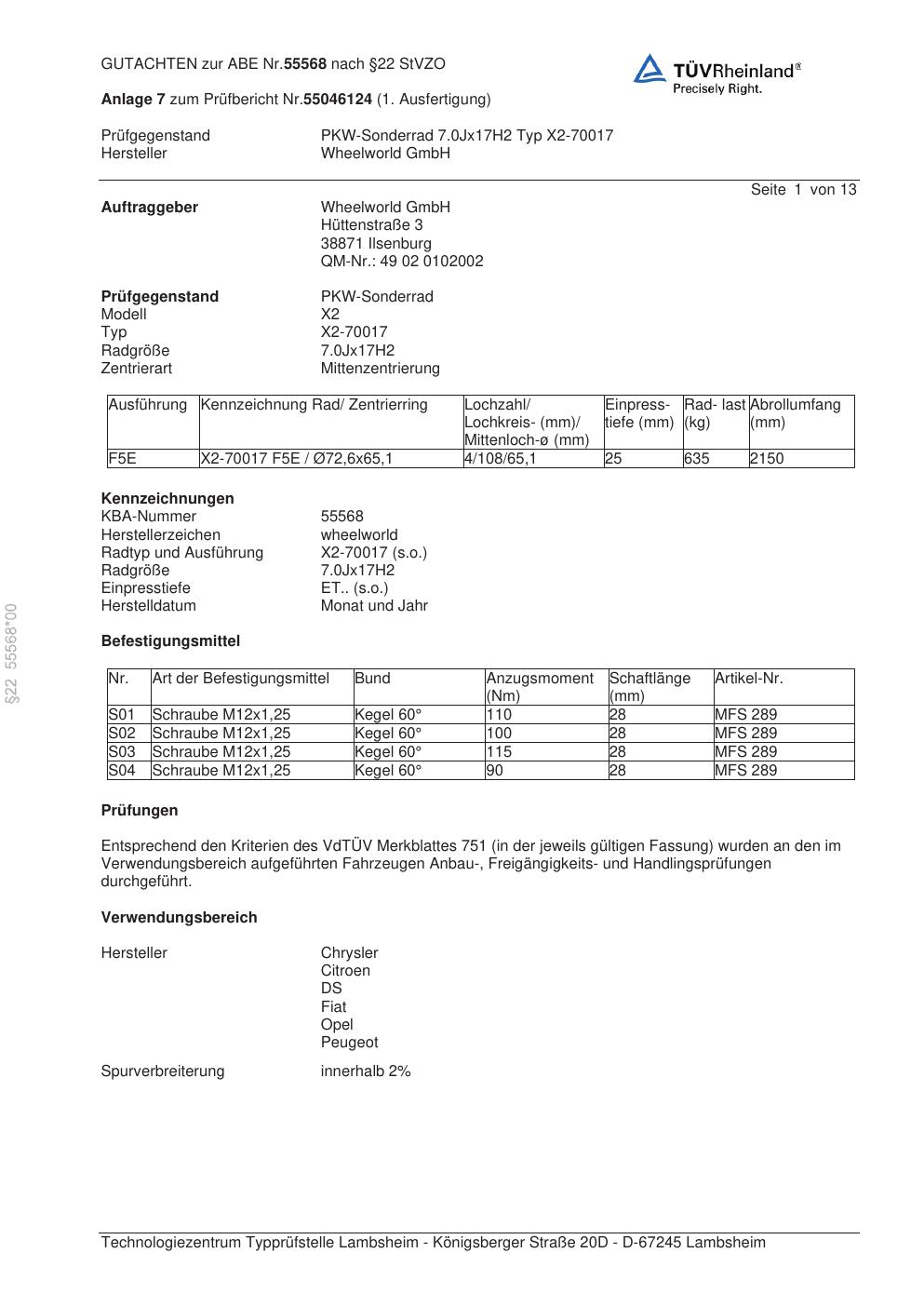 Dieses Gutachten (abe) bezieht sich auf die Alufelge Wheelworld X2-70017 in der Ausführung ET 0, Mittenloch 0 mm (KBA 55568). Im PDF findest du typischerweise zulässige Reifengrößen, Auflagen/Anbauhinweise und – je nach Dokument – Hinweise zur Eintragung.