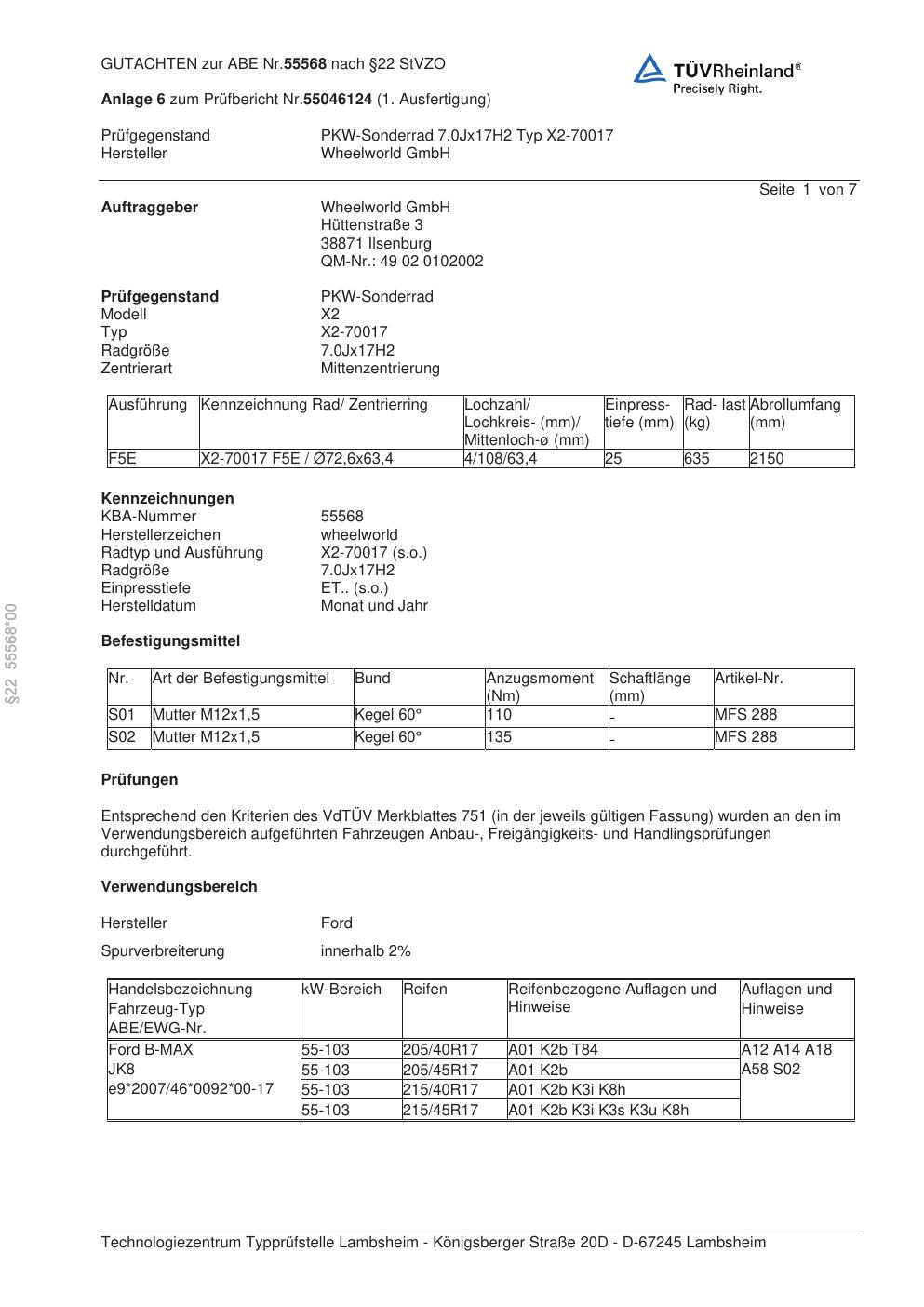 Dieses Gutachten (abe) bezieht sich auf die Alufelge Wheelworld X2-70017 in der Ausführung ET 0, Mittenloch 0 mm (KBA 55568). Im PDF findest du typischerweise zulässige Reifengrößen, Auflagen/Anbauhinweise und – je nach Dokument – Hinweise zur Eintragung.