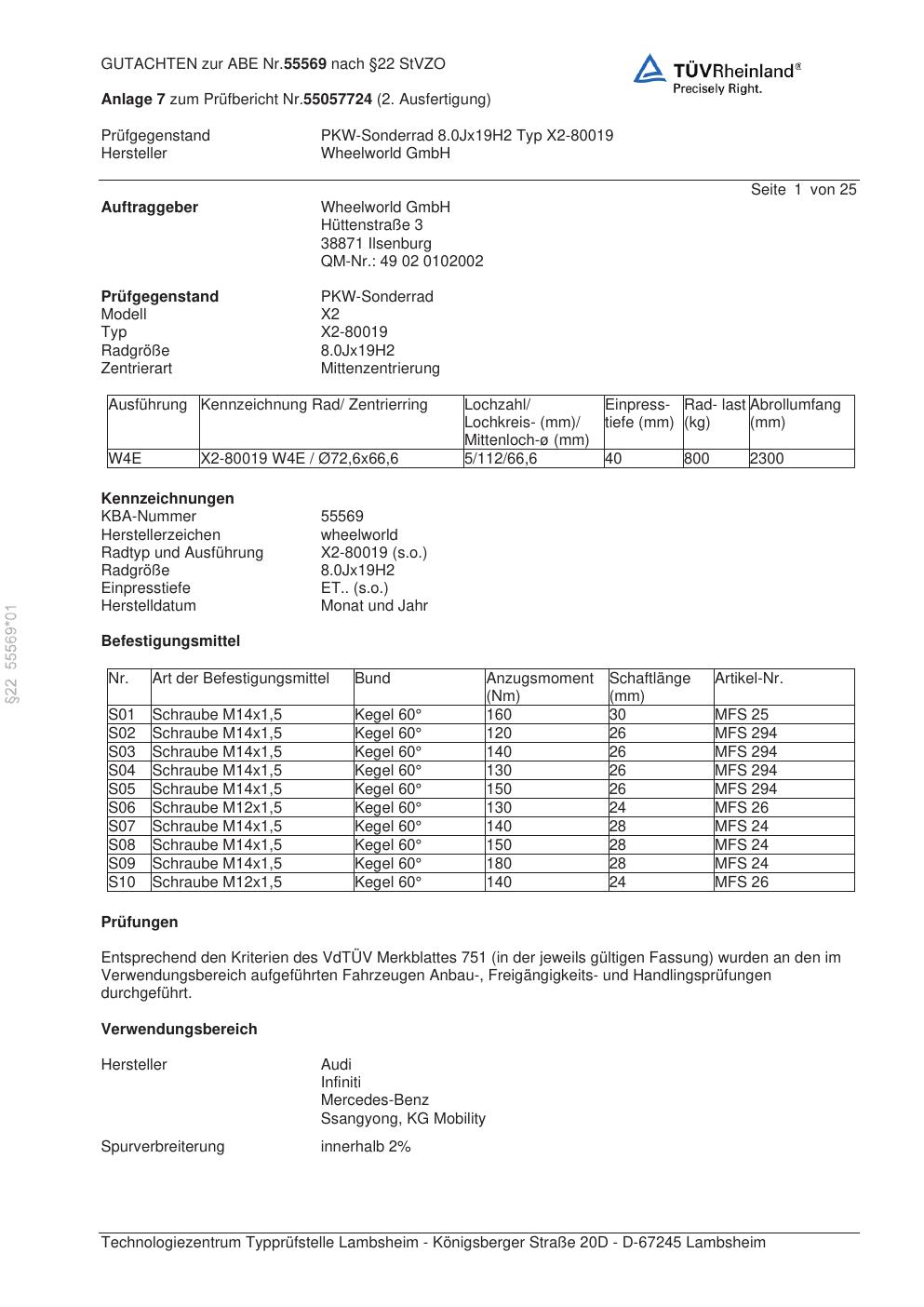 Dieses Gutachten (abe) bezieht sich auf die Alufelge Wheelworld X2-80019 in der Ausführung ET 0, Mittenloch 0 mm (KBA 55569). Im PDF findest du typischerweise zulässige Reifengrößen, Auflagen/Anbauhinweise und – je nach Dokument – Hinweise zur Eintragung.