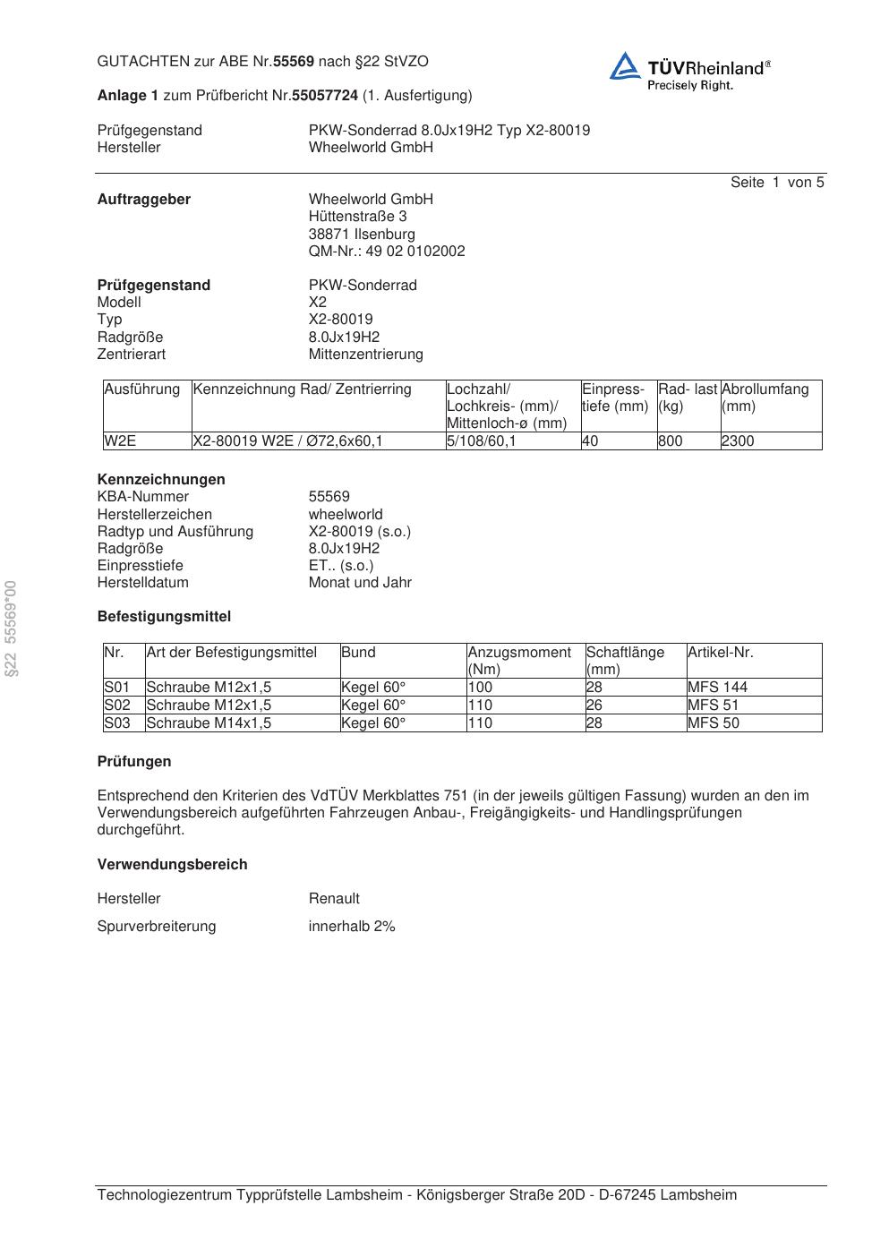 Dieses Gutachten (abe) bezieht sich auf die Alufelge Wheelworld X2-80019 in der Ausführung ET 0, Mittenloch 0 mm (KBA 55569). Im PDF findest du typischerweise zulässige Reifengrößen, Auflagen/Anbauhinweise und – je nach Dokument – Hinweise zur Eintragung.