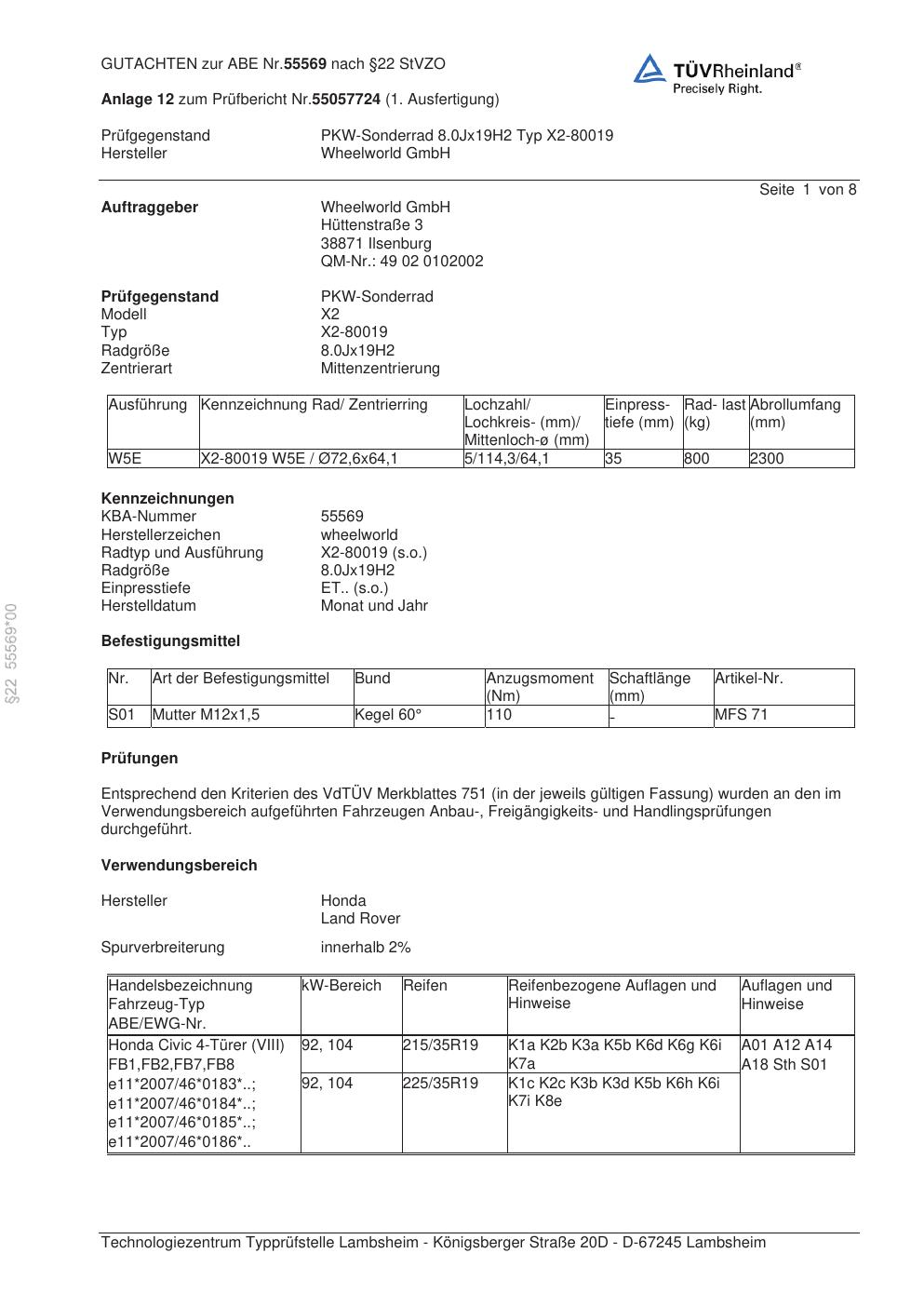Dieses Gutachten (abe) bezieht sich auf die Alufelge Wheelworld X2-80019 in der Ausführung ET 0, Mittenloch 0 mm (KBA 55569). Im PDF findest du typischerweise zulässige Reifengrößen, Auflagen/Anbauhinweise und – je nach Dokument – Hinweise zur Eintragung.