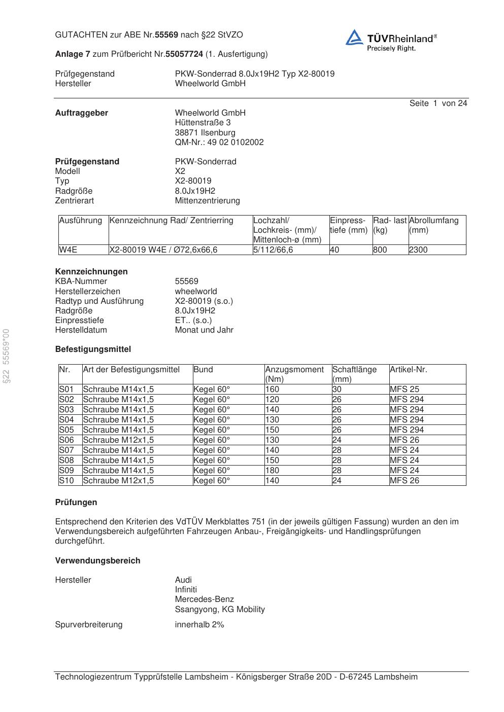 Dieses Gutachten (abe) bezieht sich auf die Alufelge Wheelworld X2-80019 in der Ausführung ET 0, Mittenloch 0 mm (KBA 55569). Im PDF findest du typischerweise zulässige Reifengrößen, Auflagen/Anbauhinweise und – je nach Dokument – Hinweise zur Eintragung.