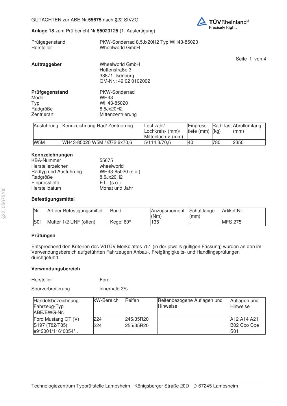 Dieses Gutachten (abe) bezieht sich auf die Alufelge Wheelworld WH43-85020 in der Ausführung ET 0, Mittenloch 0 mm (KBA 55675). Im PDF findest du typischerweise zulässige Reifengrößen, Auflagen/Anbauhinweise und – je nach Dokument – Hinweise zur Eintragung.