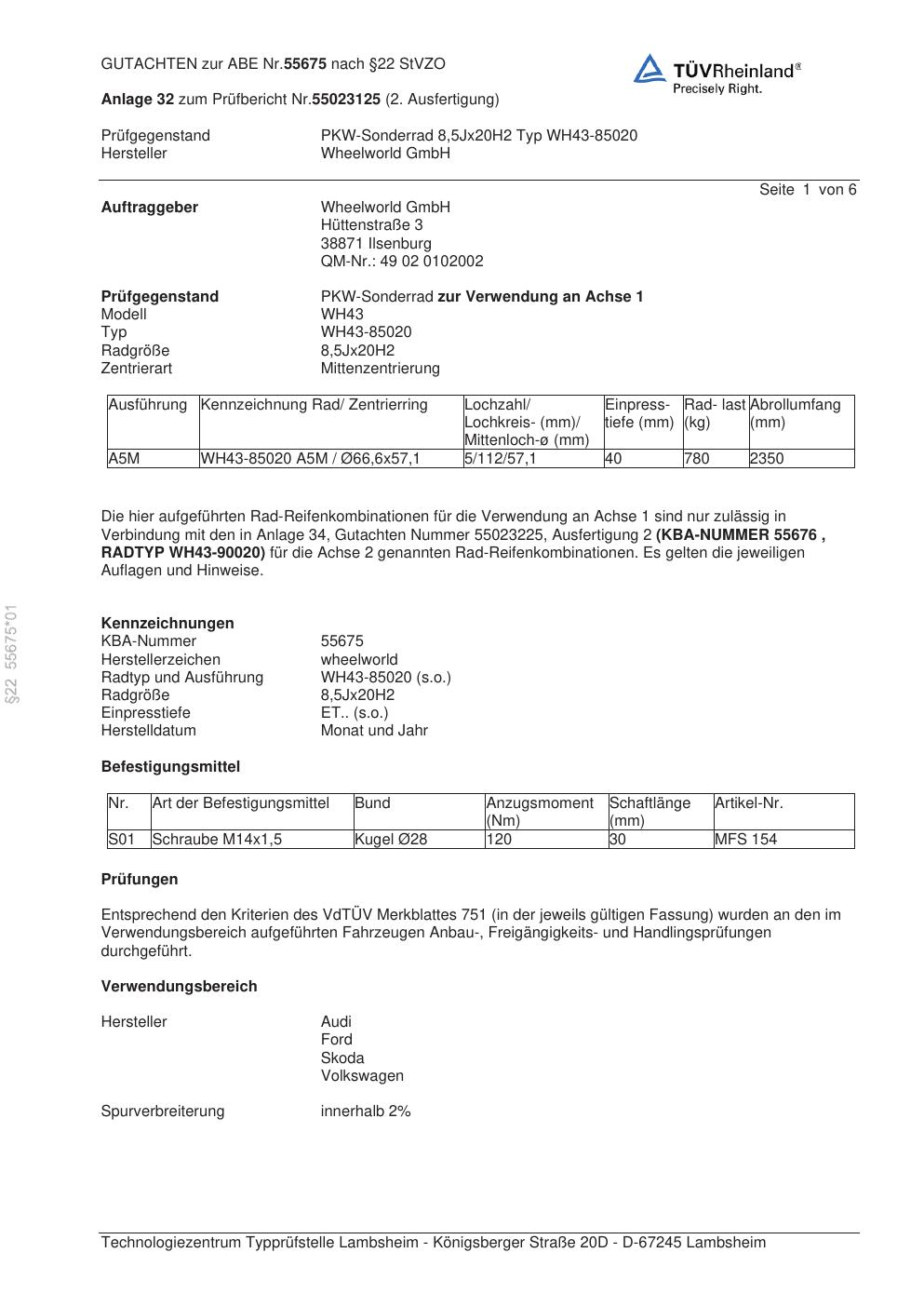Dieses Gutachten (abe) bezieht sich auf die Alufelge Wheelworld WH43-85020 in der Ausführung ET 0, Mittenloch 0 mm (KBA 55675). Im PDF findest du typischerweise zulässige Reifengrößen, Auflagen/Anbauhinweise und – je nach Dokument – Hinweise zur Eintragung.