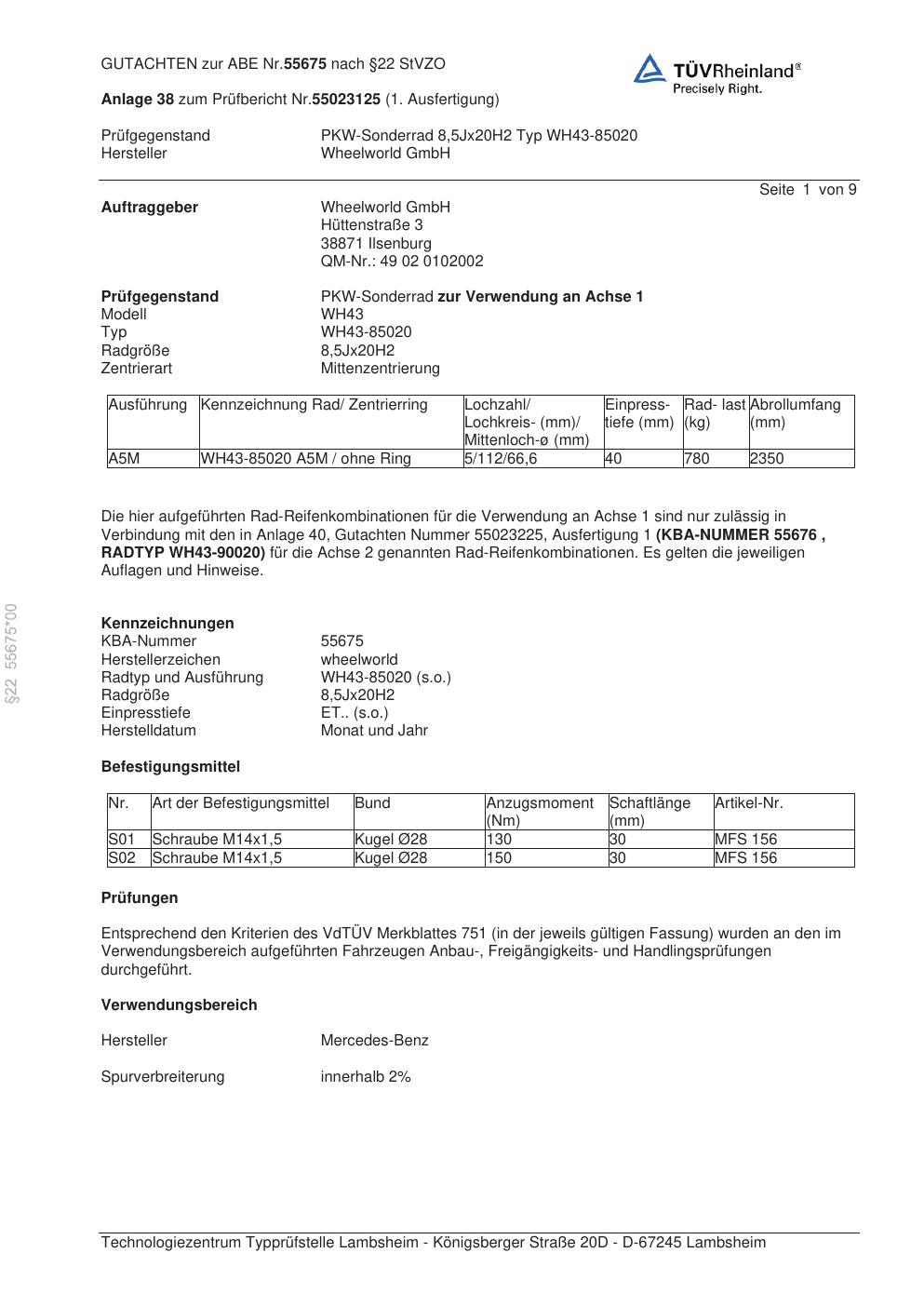 Dieses Gutachten (abe) bezieht sich auf die Alufelge Wheelworld WH43-85020 in der Ausführung ET 0, Mittenloch 0 mm (KBA 55675). Im PDF findest du typischerweise zulässige Reifengrößen, Auflagen/Anbauhinweise und – je nach Dokument – Hinweise zur Eintragung.