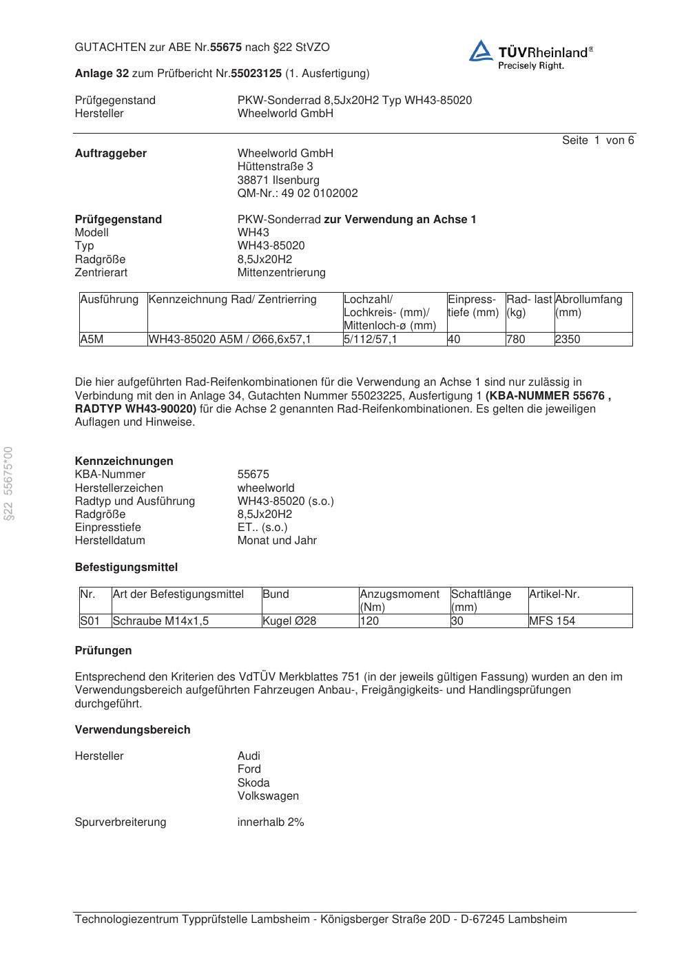 Dieses Gutachten (abe) bezieht sich auf die Alufelge Wheelworld WH43-85020 in der Ausführung ET 0, Mittenloch 0 mm (KBA 55675). Im PDF findest du typischerweise zulässige Reifengrößen, Auflagen/Anbauhinweise und – je nach Dokument – Hinweise zur Eintragung.
