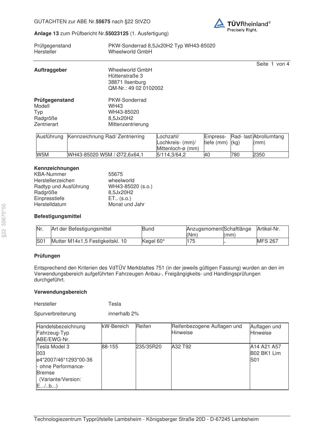 Dieses Gutachten (abe) bezieht sich auf die Alufelge Wheelworld WH43-85020 in der Ausführung ET 0, Mittenloch 0 mm (KBA 55675). Im PDF findest du typischerweise zulässige Reifengrößen, Auflagen/Anbauhinweise und – je nach Dokument – Hinweise zur Eintragung.