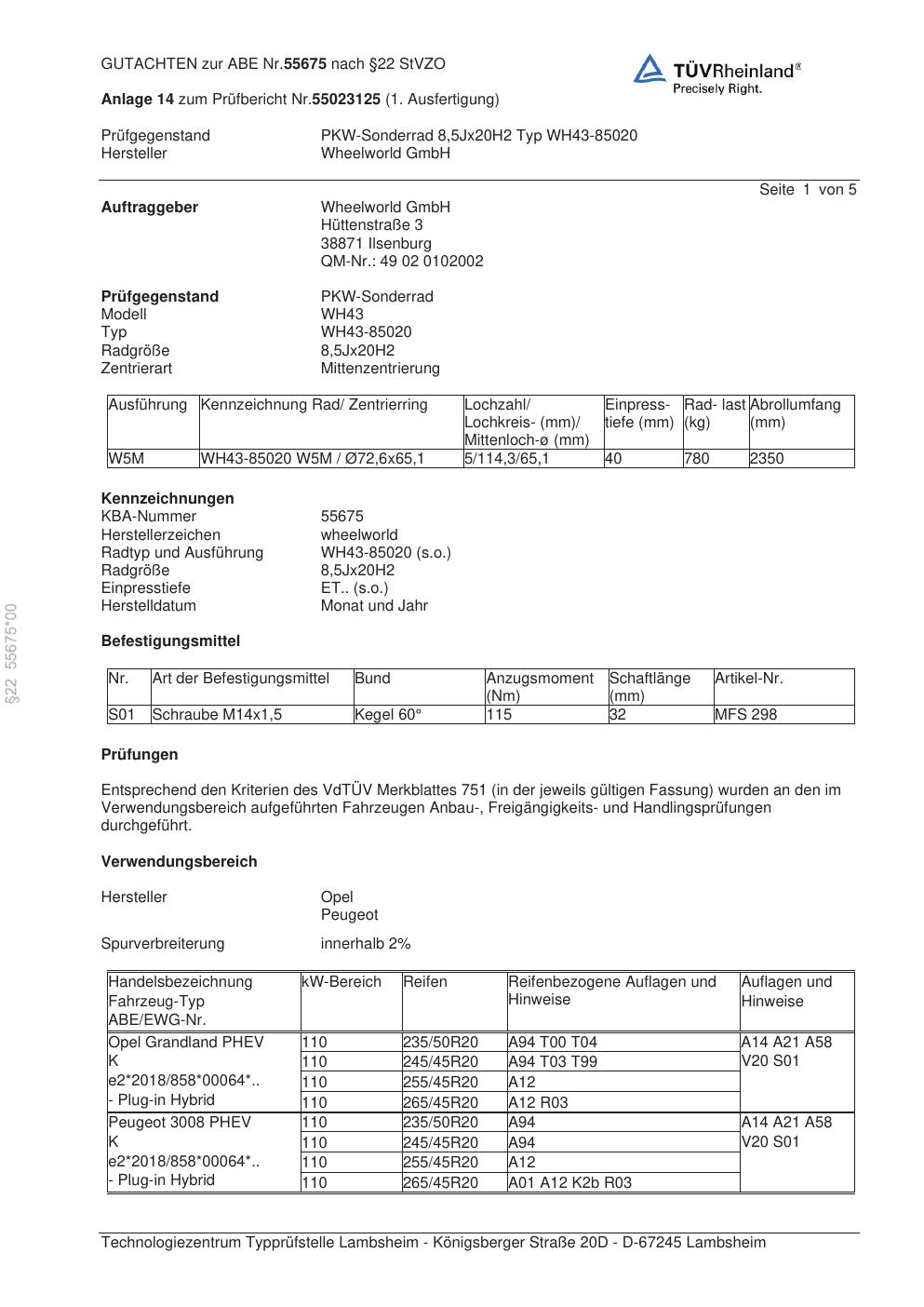 Dieses Gutachten (abe) bezieht sich auf die Alufelge Wheelworld WH43-85020 in der Ausführung ET 0, Mittenloch 0 mm (KBA 55675). Im PDF findest du typischerweise zulässige Reifengrößen, Auflagen/Anbauhinweise und – je nach Dokument – Hinweise zur Eintragung.