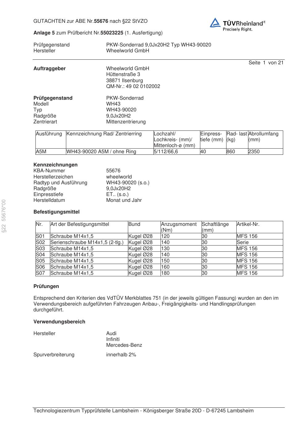 Dieses Gutachten (abe) bezieht sich auf die Alufelge Wheelworld WH43-90020 in der Ausführung ET 0, Mittenloch 0 mm (KBA 55676). Im PDF findest du typischerweise zulässige Reifengrößen, Auflagen/Anbauhinweise und – je nach Dokument – Hinweise zur Eintragung.