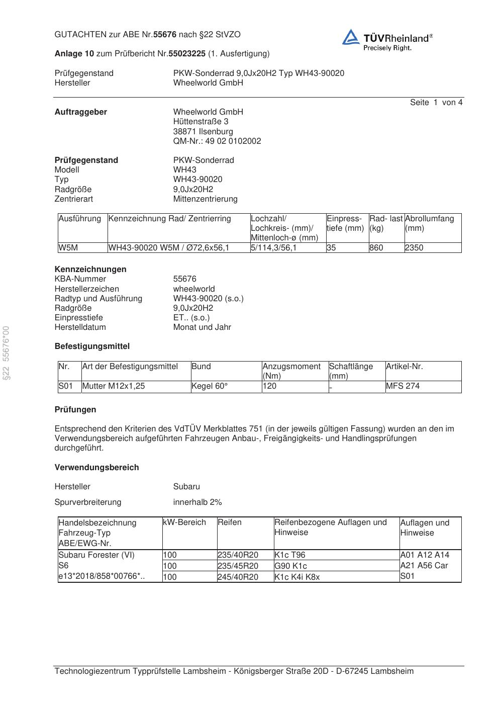 Dieses Gutachten (abe) bezieht sich auf die Alufelge Wheelworld WH43-90020 in der Ausführung ET 0, Mittenloch 0 mm (KBA 55676). Im PDF findest du typischerweise zulässige Reifengrößen, Auflagen/Anbauhinweise und – je nach Dokument – Hinweise zur Eintragung.