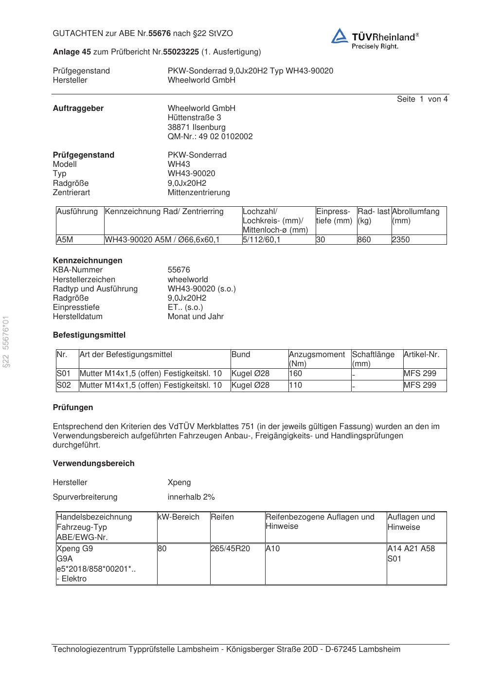 Dieses Gutachten (abe) bezieht sich auf die Alufelge Wheelworld WH43-90020 in der Ausführung ET 0, Mittenloch 0 mm (KBA 55676). Im PDF findest du typischerweise zulässige Reifengrößen, Auflagen/Anbauhinweise und – je nach Dokument – Hinweise zur Eintragung.