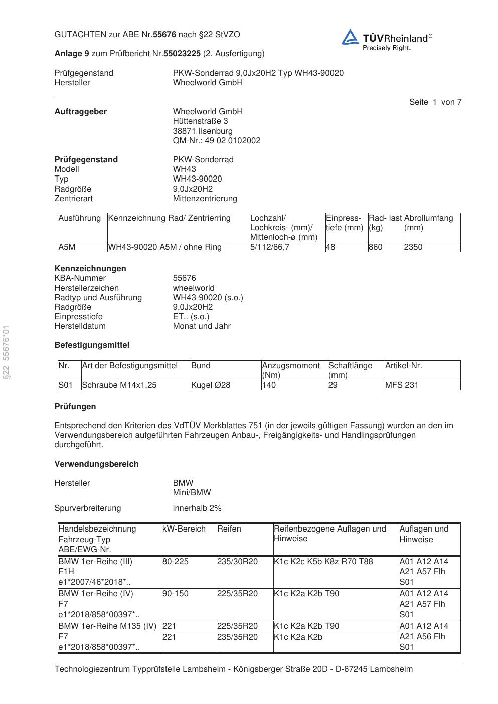 Dieses Gutachten (abe) bezieht sich auf die Alufelge Wheelworld WH43-90020 in der Ausführung ET 0, Mittenloch 0 mm (KBA 55676). Im PDF findest du typischerweise zulässige Reifengrößen, Auflagen/Anbauhinweise und – je nach Dokument – Hinweise zur Eintragung.