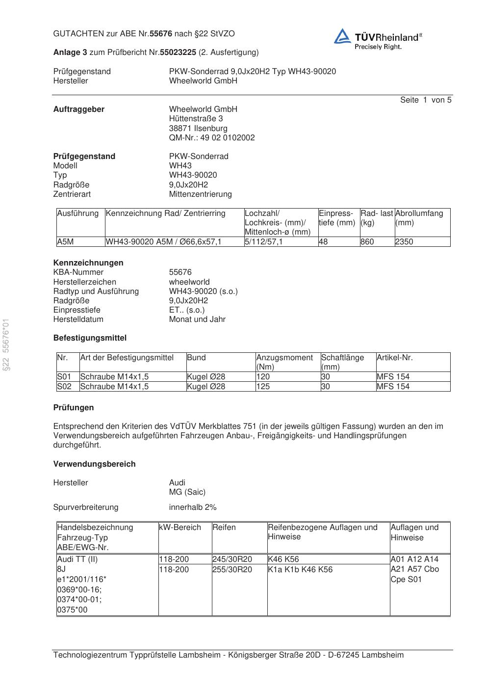 Dieses Gutachten (abe) bezieht sich auf die Alufelge Wheelworld WH43-90020 in der Ausführung ET 0, Mittenloch 0 mm (KBA 55676). Im PDF findest du typischerweise zulässige Reifengrößen, Auflagen/Anbauhinweise und – je nach Dokument – Hinweise zur Eintragung.