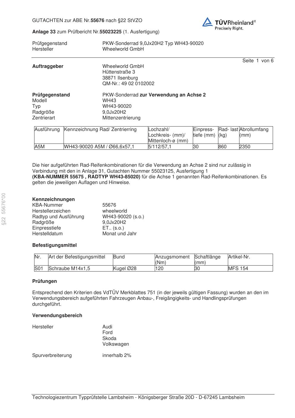Dieses Gutachten (abe) bezieht sich auf die Alufelge Wheelworld WH43-90020 in der Ausführung ET 0, Mittenloch 0 mm (KBA 55676). Im PDF findest du typischerweise zulässige Reifengrößen, Auflagen/Anbauhinweise und – je nach Dokument – Hinweise zur Eintragung.