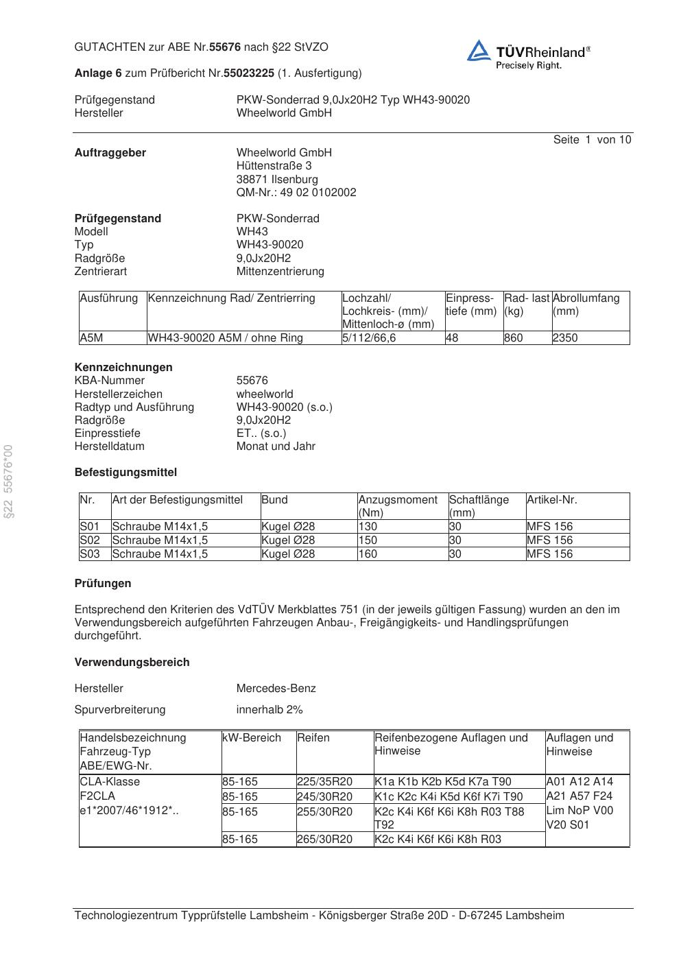 Dieses Gutachten (abe) bezieht sich auf die Alufelge Wheelworld WH43-90020 in der Ausführung ET 0, Mittenloch 0 mm (KBA 55676). Im PDF findest du typischerweise zulässige Reifengrößen, Auflagen/Anbauhinweise und – je nach Dokument – Hinweise zur Eintragung.