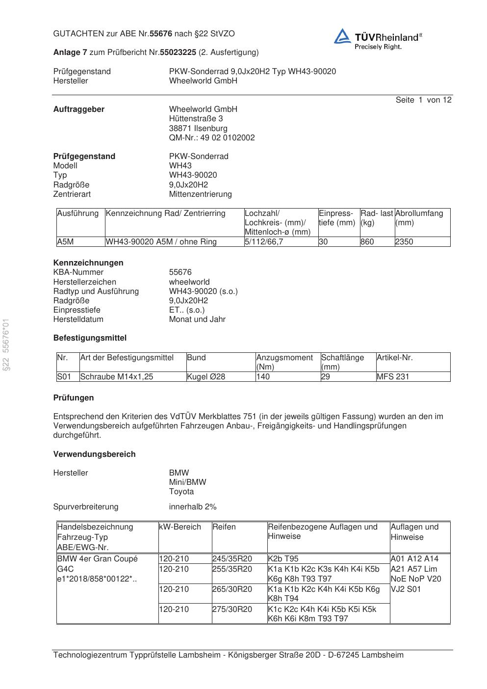 Dieses Gutachten (abe) bezieht sich auf die Alufelge Wheelworld WH43-90020 in der Ausführung ET 0, Mittenloch 0 mm (KBA 55676). Im PDF findest du typischerweise zulässige Reifengrößen, Auflagen/Anbauhinweise und – je nach Dokument – Hinweise zur Eintragung.