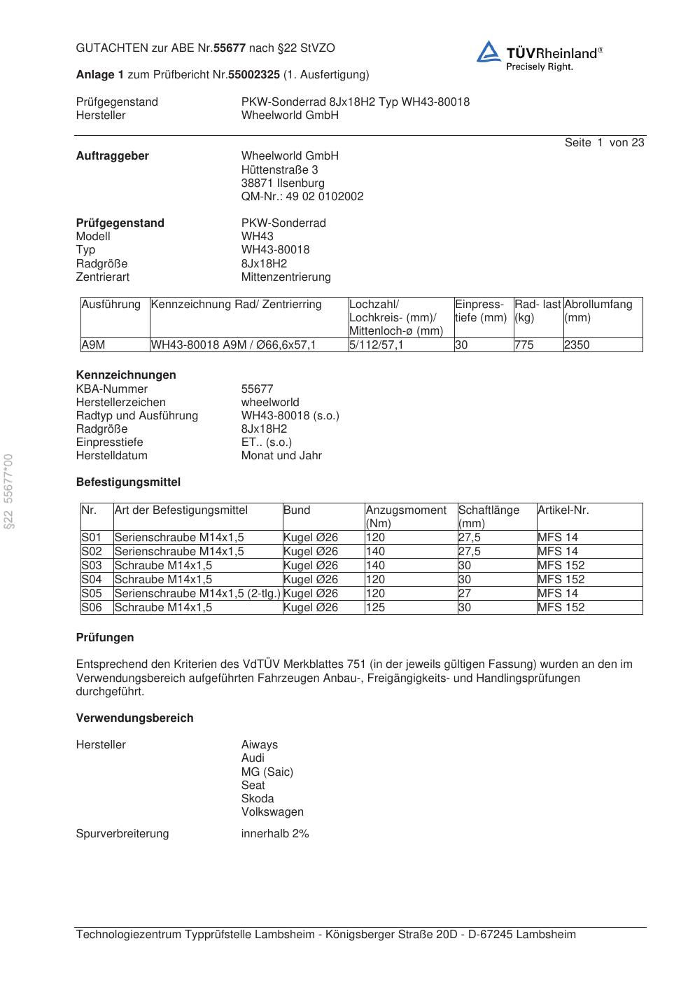 Dieses Gutachten (abe) bezieht sich auf die Alufelge Wheelworld WH43-80018 in der Ausführung ET 0, Mittenloch 0 mm (KBA 55677). Im PDF findest du typischerweise zulässige Reifengrößen, Auflagen/Anbauhinweise und – je nach Dokument – Hinweise zur Eintragung.