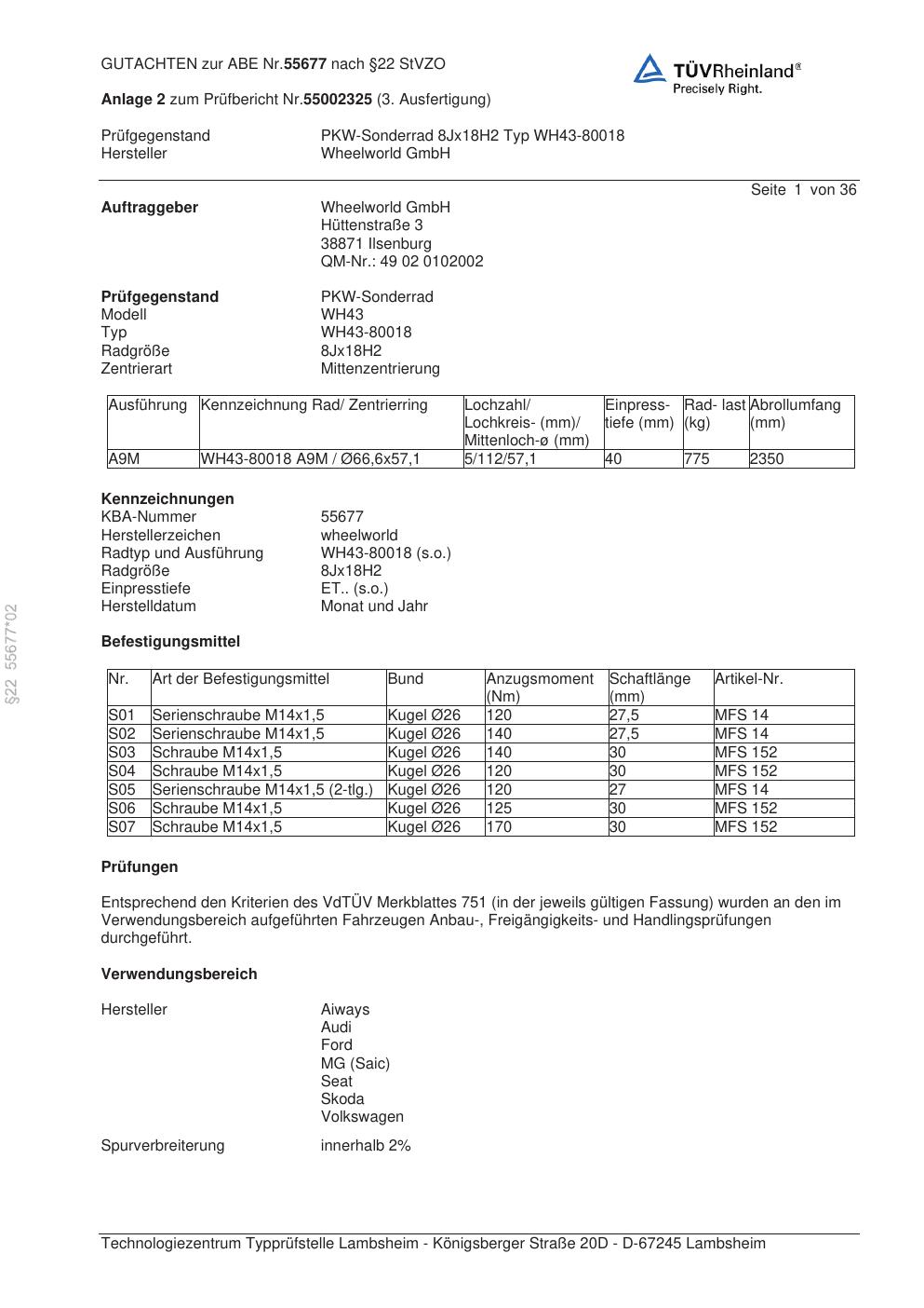 Dieses Gutachten (abe) bezieht sich auf die Alufelge Wheelworld WH43-80018 in der Ausführung ET 0, Mittenloch 0 mm (KBA 55677). Im PDF findest du typischerweise zulässige Reifengrößen, Auflagen/Anbauhinweise und – je nach Dokument – Hinweise zur Eintragung.