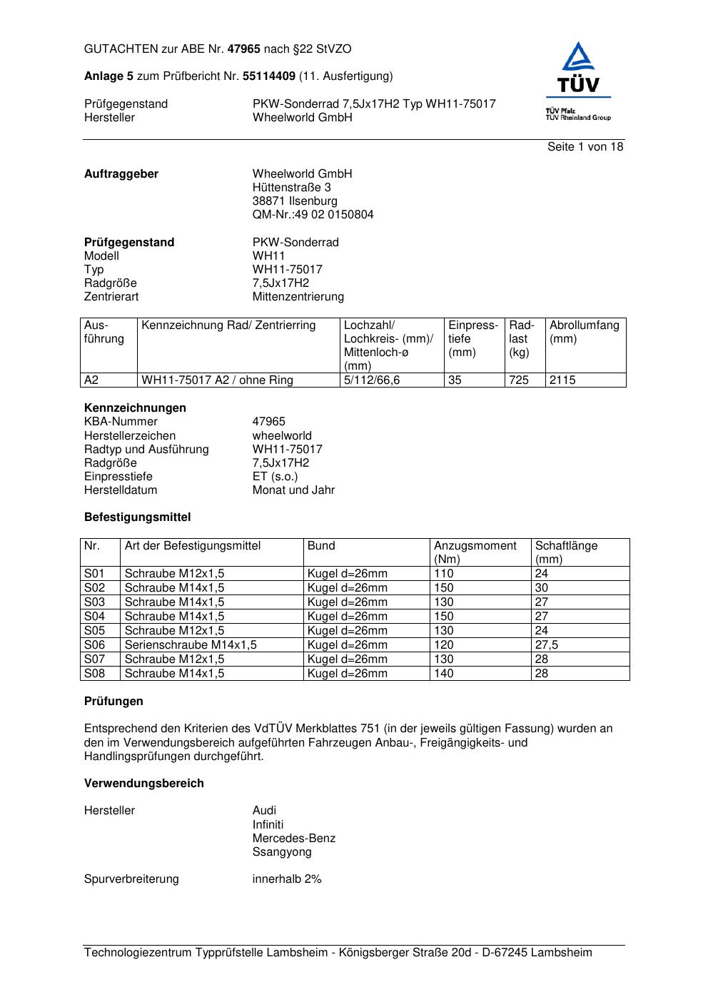 Dieses Gutachten (abe) bezieht sich auf die Alufelge Wheelworld GmbH WH11-750 17 in der Ausführung ET 0, Mittenloch 0 mm (KBA 47965). Im PDF findest du typischerweise zulässige Reifengrößen, Auflagen/Anbauhinweise und – je nach Dokument – Hinweise zur Eintragung.