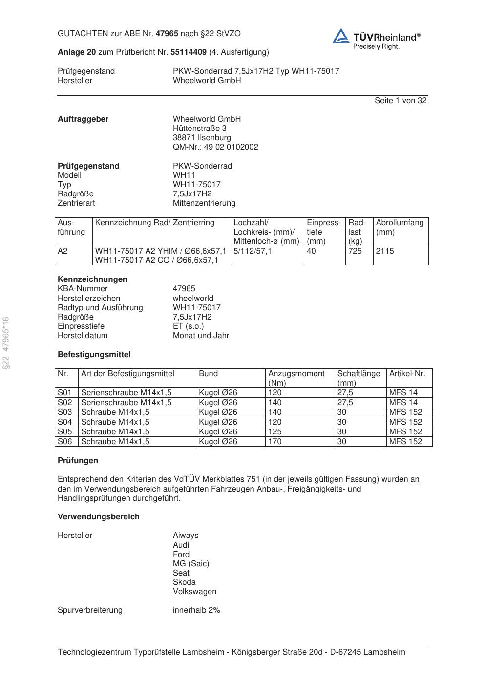 Dieses Gutachten (abe) bezieht sich auf die Alufelge Wheelworld GmbH WH11-75017 in der Ausführung ET 0, Mittenloch 0 mm (KBA 47965). Im PDF findest du typischerweise zulässige Reifengrößen, Auflagen/Anbauhinweise und – je nach Dokument – Hinweise zur Eintragung.