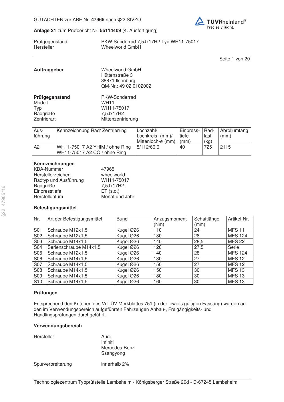 Dieses Gutachten (abe) bezieht sich auf die Alufelge Wheelworld GmbH WH11-75017 in der Ausführung ET 0, Mittenloch 0 mm (KBA 47965). Im PDF findest du typischerweise zulässige Reifengrößen, Auflagen/Anbauhinweise und – je nach Dokument – Hinweise zur Eintragung.