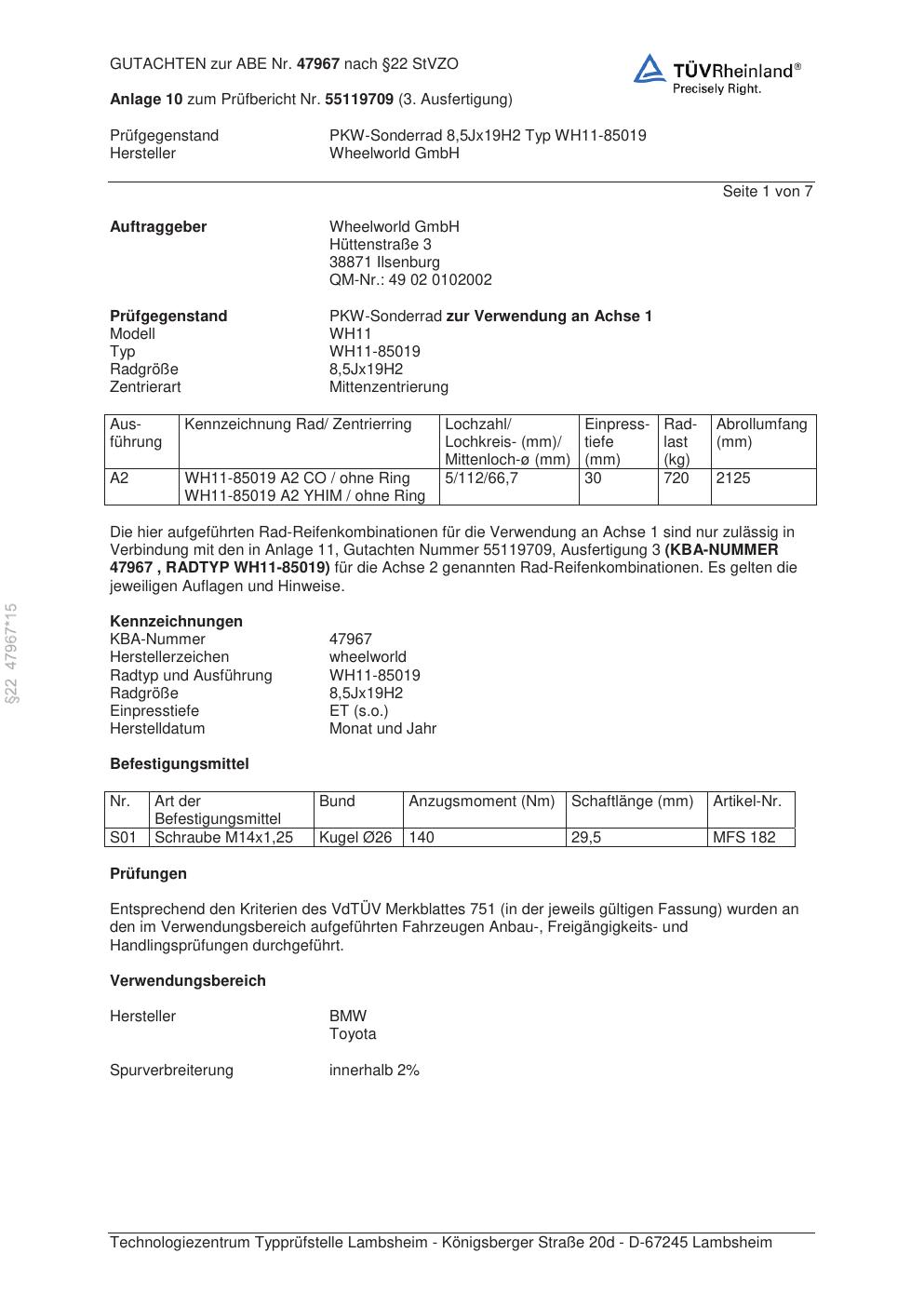 Dieses Gutachten (abe) bezieht sich auf die Alufelge Wheelworld GmbH WH11-85019 in der Ausführung ET 0, Mittenloch 0 mm (KBA 47967). Im PDF findest du typischerweise zulässige Reifengrößen, Auflagen/Anbauhinweise und – je nach Dokument – Hinweise zur Eintragung.